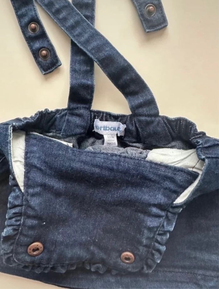 Robe salopette en jean, pressions, deux poches sur le devant > Marque vert baudet > Taille 3mois Etat neuf, ne présente aucun défaut, ni tache, ni trou Envoie rapide et soigné N'hésitez pas à me contacter pour plus de photos ou d'informations