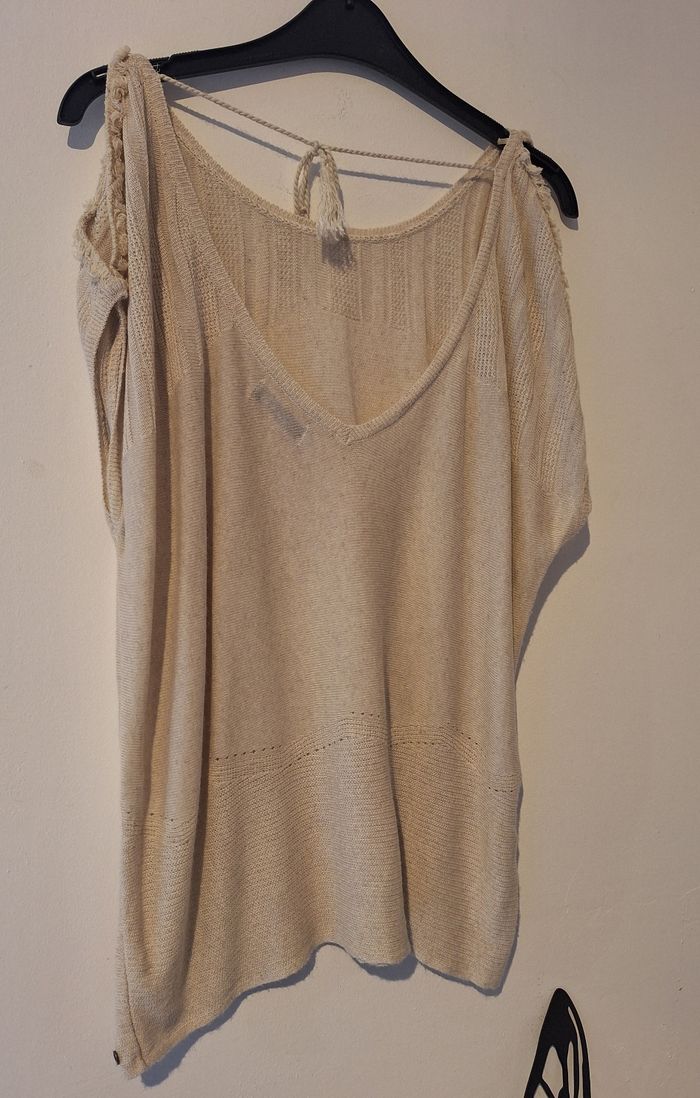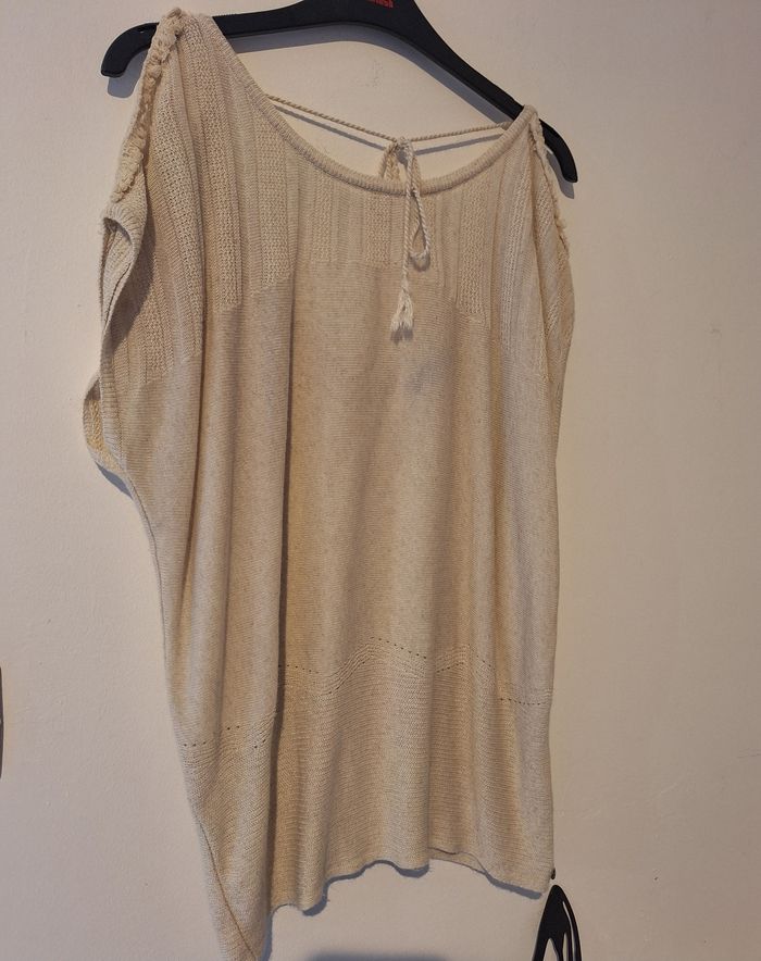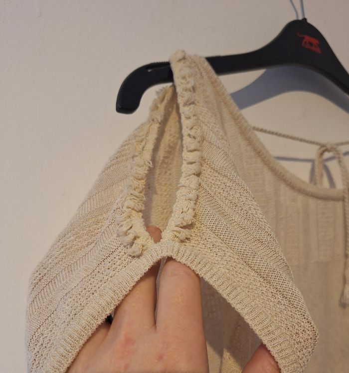 FEMME 34 / XS N°1629 pull sans manches Fin, ecru moucheti Épaule dénudé / crochet Col au dos en v , plus lacet Taille 34 / xs Bonobo 6€50 #kelly_femmeT34