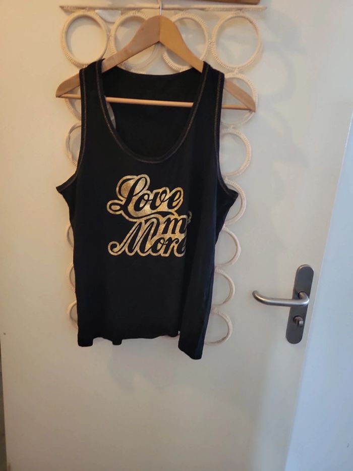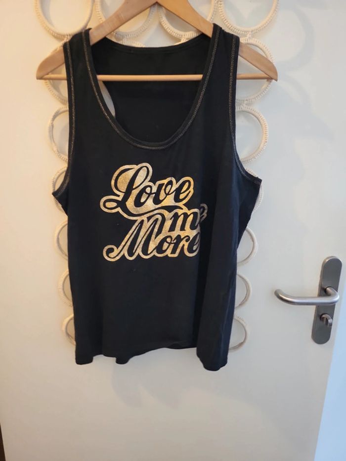 Débardeur noir avec écriture dorée. Taille XL. Malheureusement etiquette coupée. Jennyfer. Bon état. Aisselle à Aisselle à plat 48cm Longeur total 65cm #echelon1842