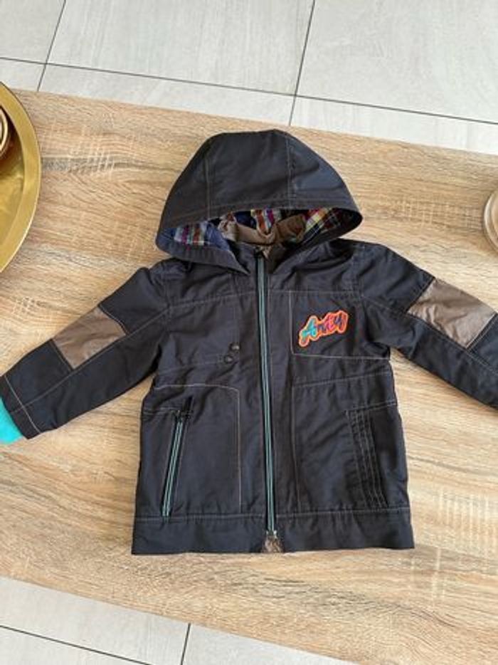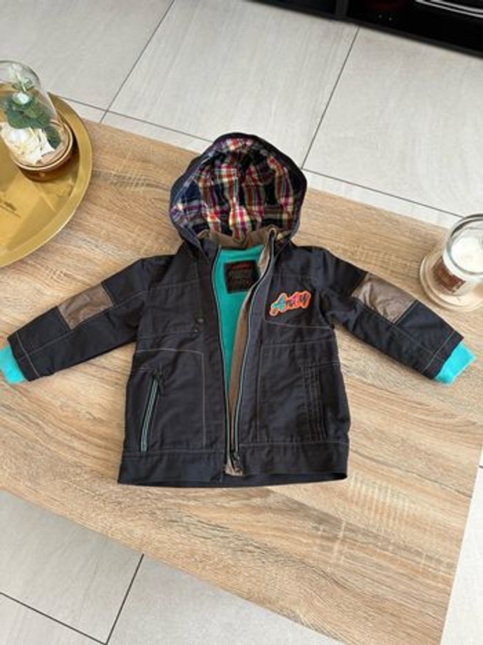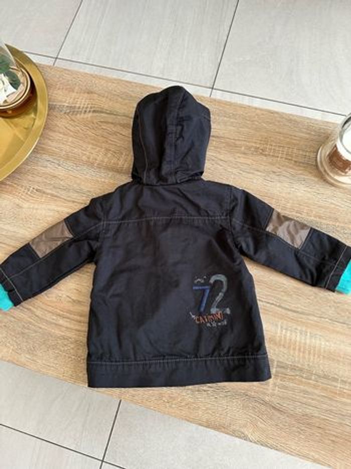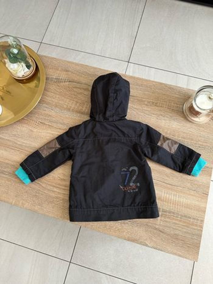 Veste à capuche noire , marron et doublure bleu , doublure à carreaux dans la capuche taille 12 mois Catimini en très bon état