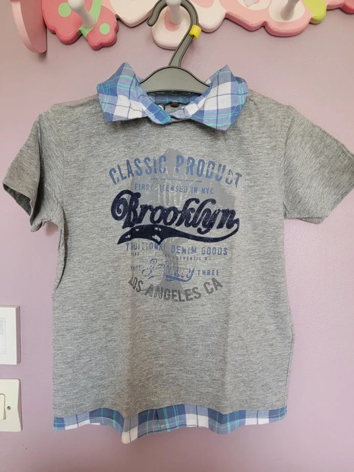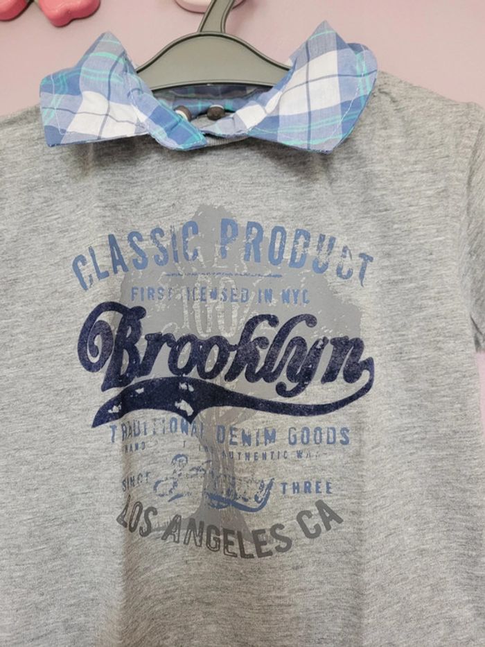 Tee-shirt façon chemise, le col est amovible par boutons. Marque Vertbaudet, 4 ans. Bon état, l'écriture Brooklyn est un peu passée. #garçon4ansgain_de_place