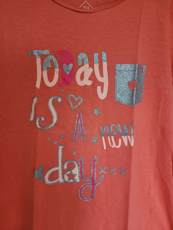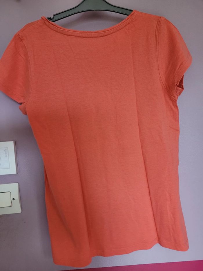 Tee-shirt été fille de marque Tex, 12 ans, bon état, couleur corail et écritures pailletées. #fille12ansgain_de_place