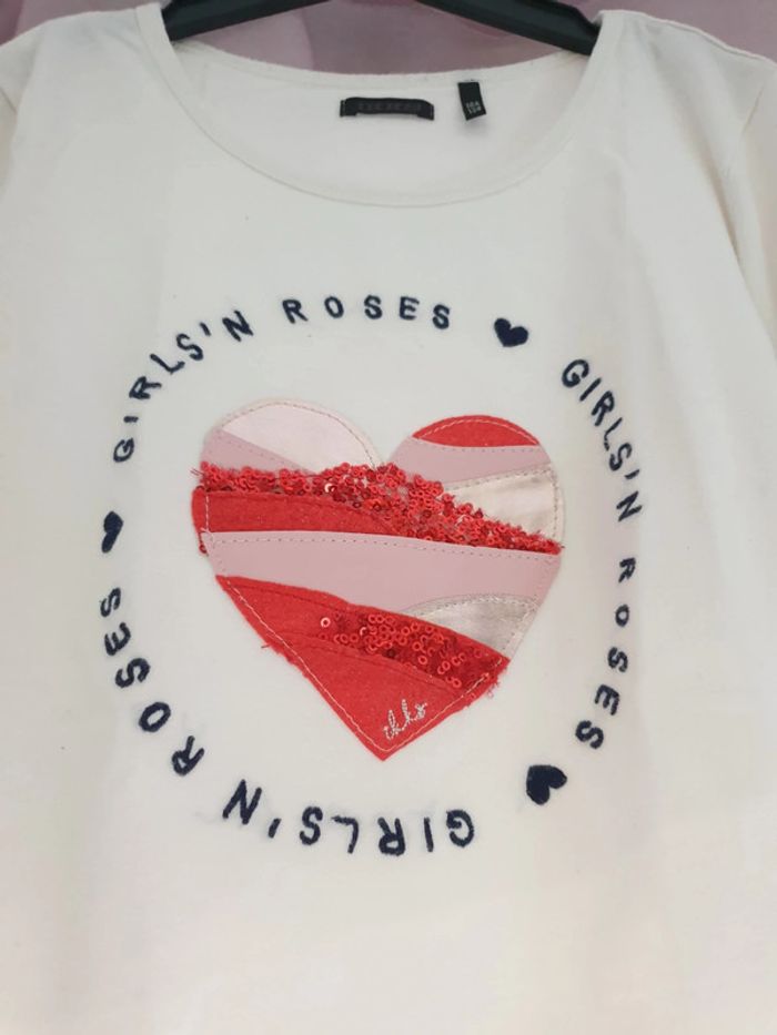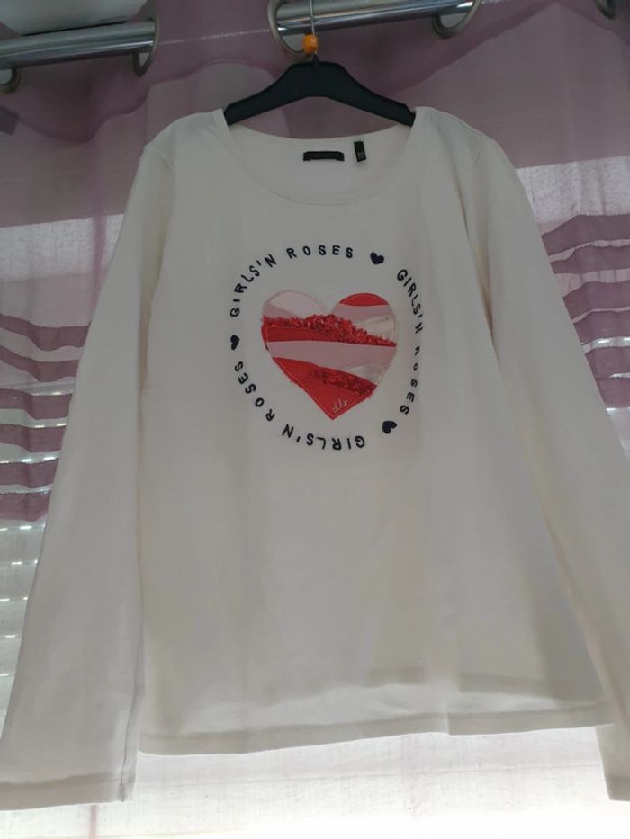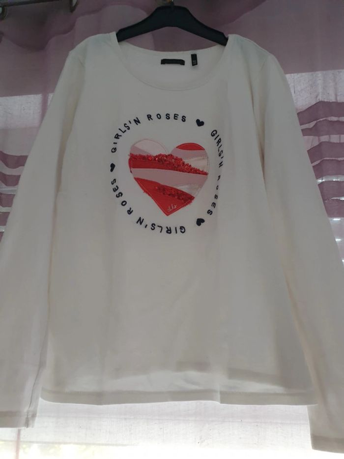 Marque IKKS, bien porté mais reste très correct (quelques bouloches à l'intérieur du col). Manches longues avec motif cœur ❤. Taille 10 ans. #fille10ansgain_de_place