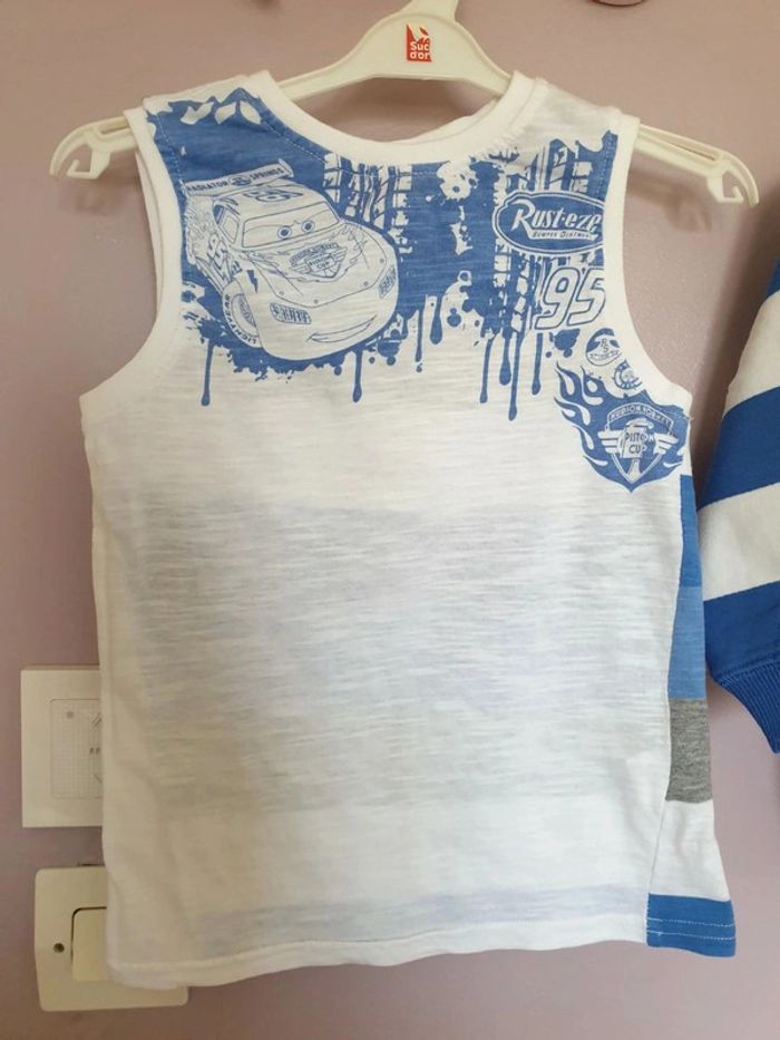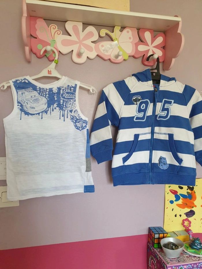 Ensemble été Cars garçon 👦 en taille 4 ans composé d'une veste zippée style jogging + débardeur. Bon état, couleur un peu passée peut-être sur le devant de la veste. #garçon4ansgain_de_place