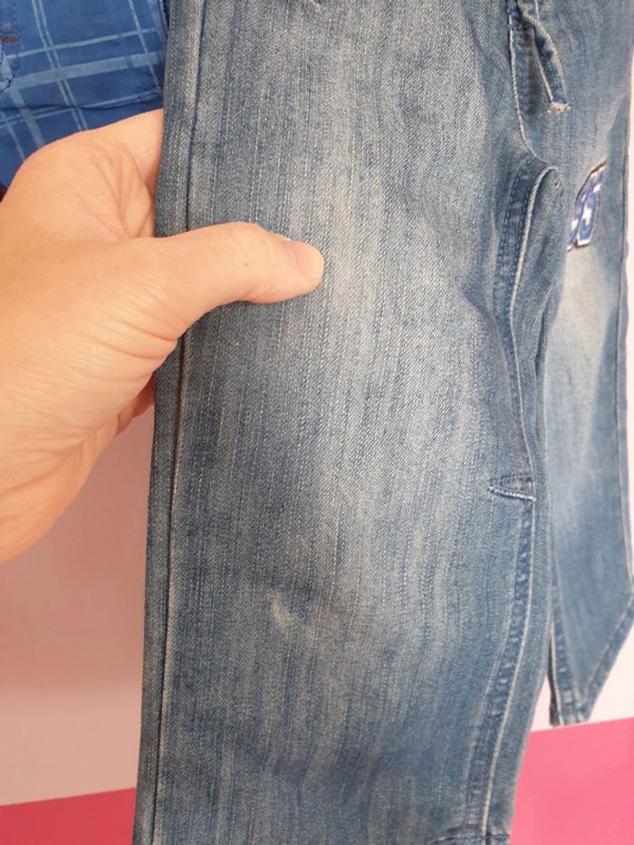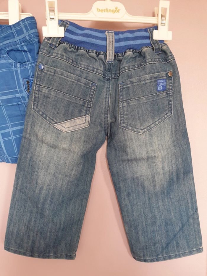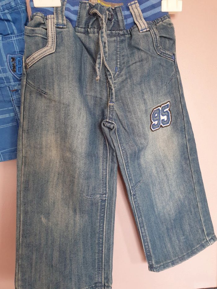 Lot de 2 shorts garçon : short, petit 3 ans soit 92 cm et bermuda en jean grand 3 ans car 98 cm. Bon état hormis 1 petite trace sur celui en jean et quelques bouloches au niveau de la ceinture. Marque Orchestra. #garçon3ansgain_de_place