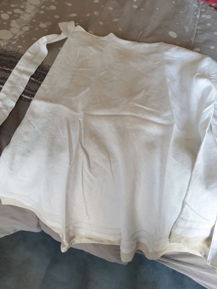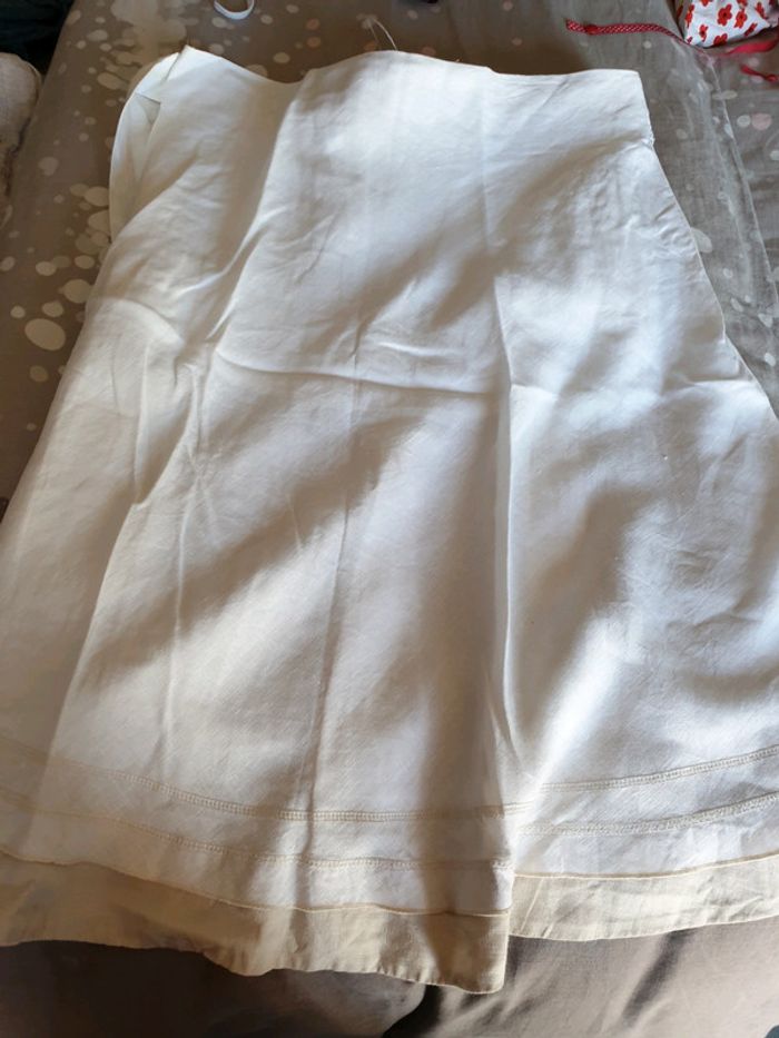 Blanche avec un liseret en bas beige avec lien à la taille. Taille 44, porté mais bon état. Très agréable pour l'été. #femme44gain_de_place