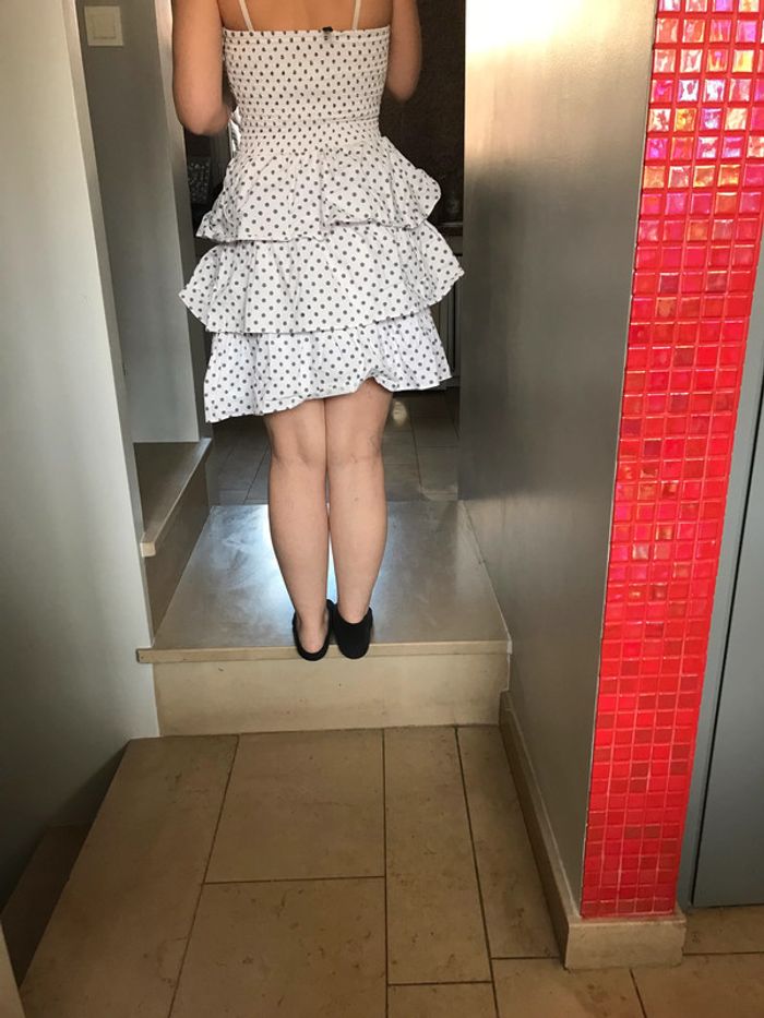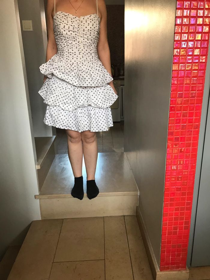 robe bustier femme , a pois gris , 3 volants , fermeture eclair sur le cotes , boutons devant , taille 36 , NAF NAF bon etat