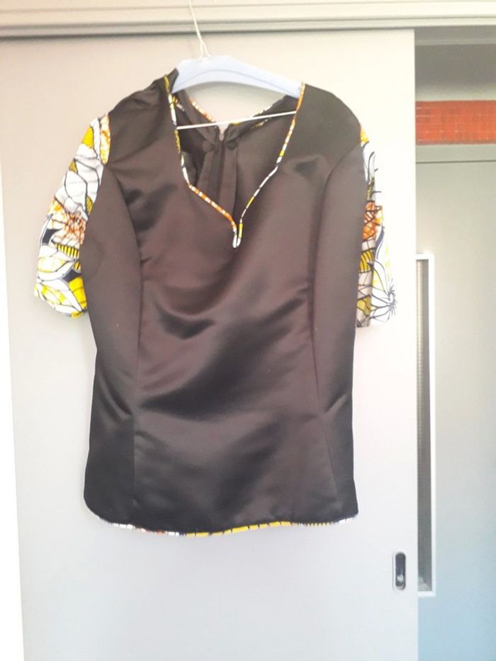 Haut femme noir manche en wax et tout le tour du haut fait sur mesure porté 1 fois petite manche tissu façon satiné tres bon etat