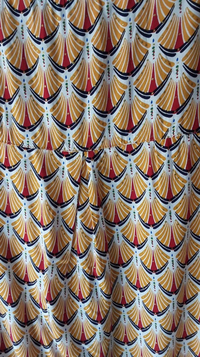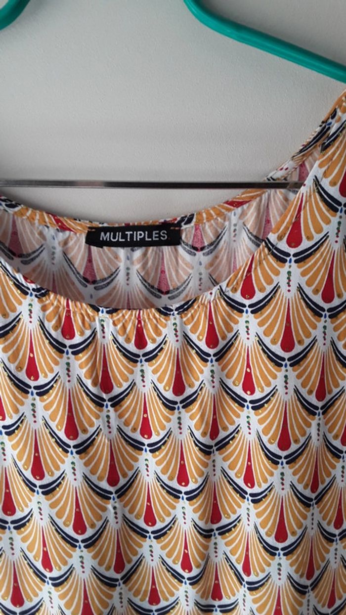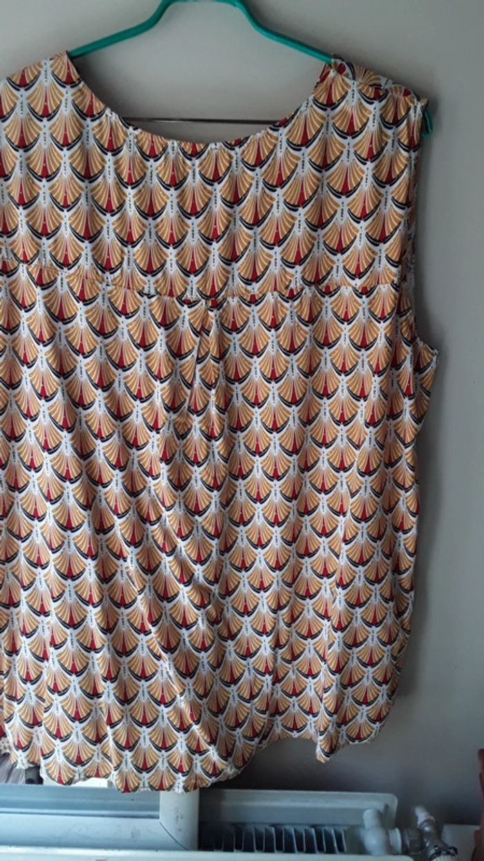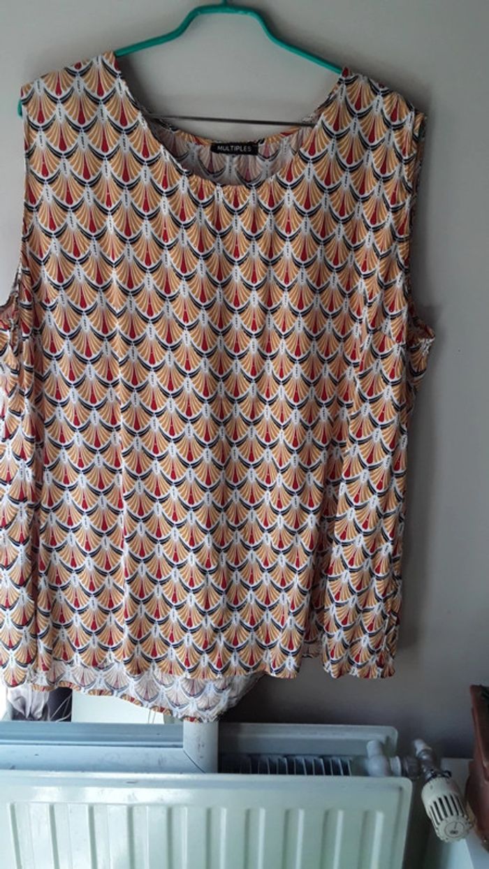 Vends débardeur en viscose,neuf juste lavé, acheté pour ma fille et ne lui plaît pas...trop grand pour moi,jamais porte ,imprimé style art deco taille 48,50 traits dorés dans les couleurs( peut être pas visibles sur photos)
