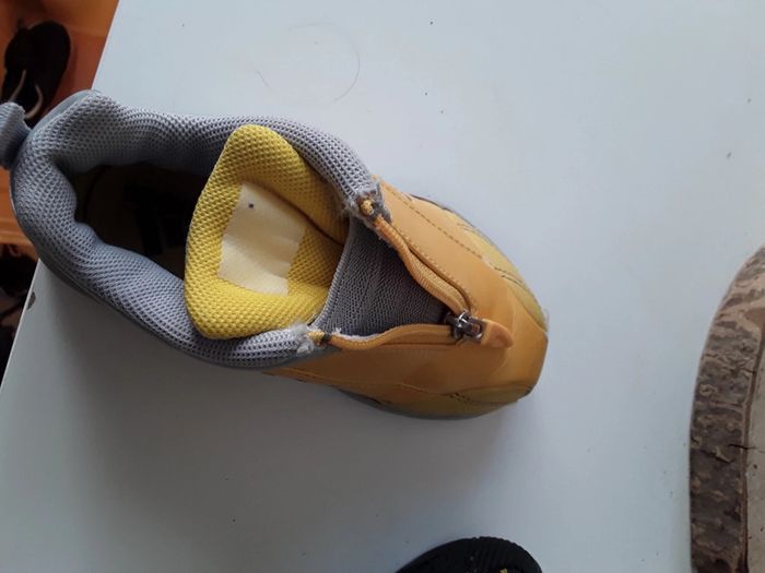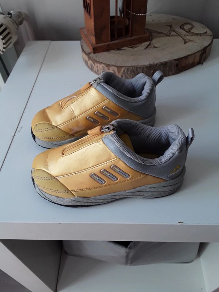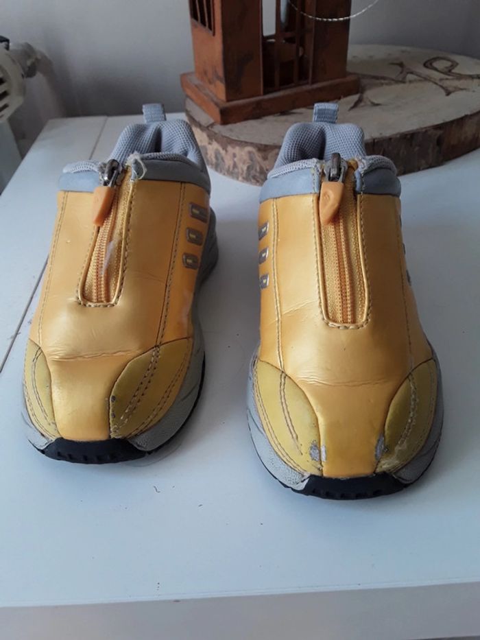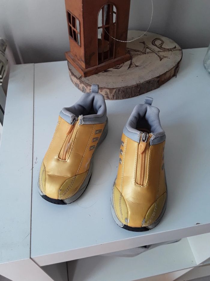Vends baskets fille originales cuir jaune irise ,fermeture éclair avec élastique en dessous pour ample ouverture,taille approximative par comparaison 23 24 l étiquette n existant plus et rien sur semelles...traces usure sur une des 2 chaussures voir photos