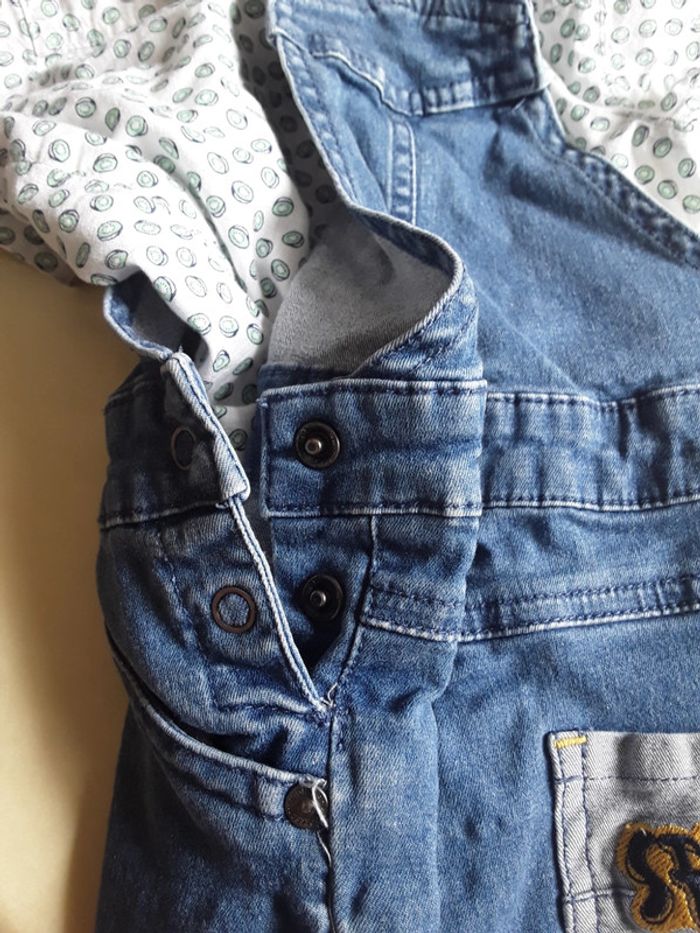 Vends ensemble salopette courte bretelles réglables 2 pressions et ouverture pressions en bas pour change chemise motif kiwis en coton les 2 taille 23mois
