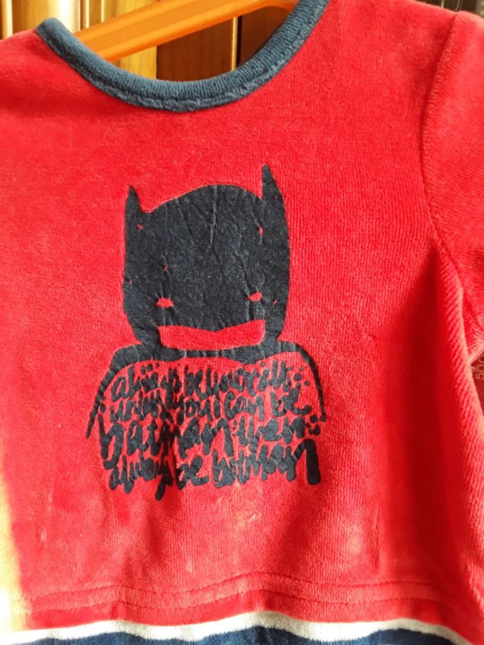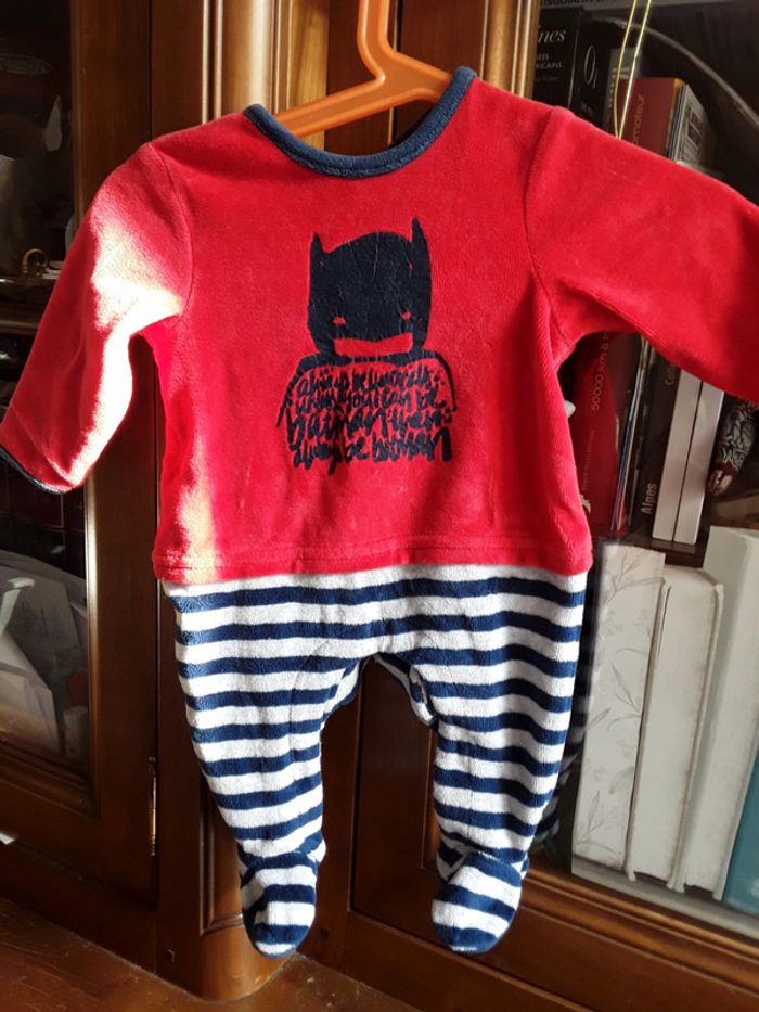 Vends pyjama velours nouveau né garcon motif batman taille 1mois ou naissance si gros bébé 😏 ce qu' on pourrait voir comme des taches sur les photos sont des reflets de soleil! Il est nickel