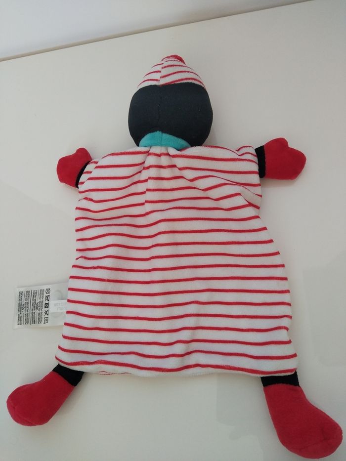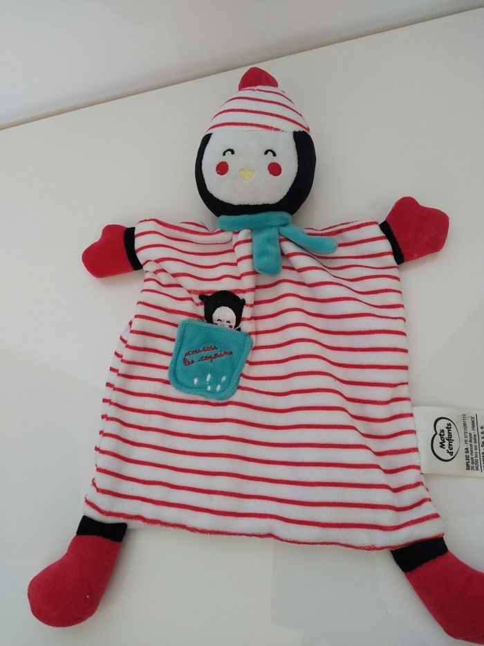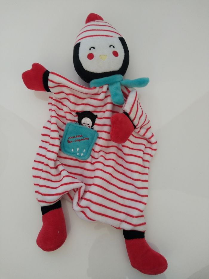 Petit doudou plat pingouin déguisé couvert de son bonnet et moufles Rayures blanches et rouge type marinière