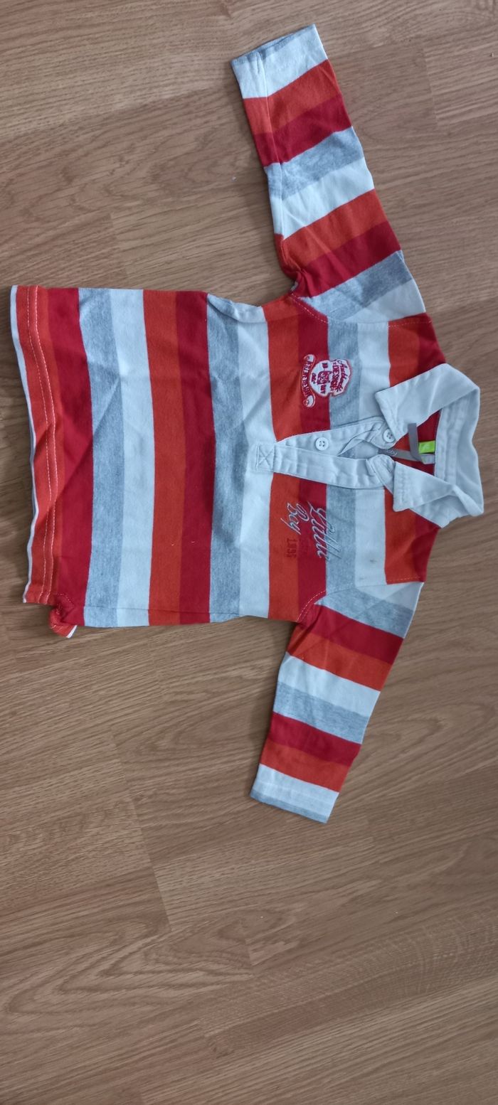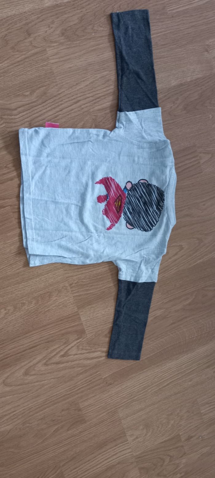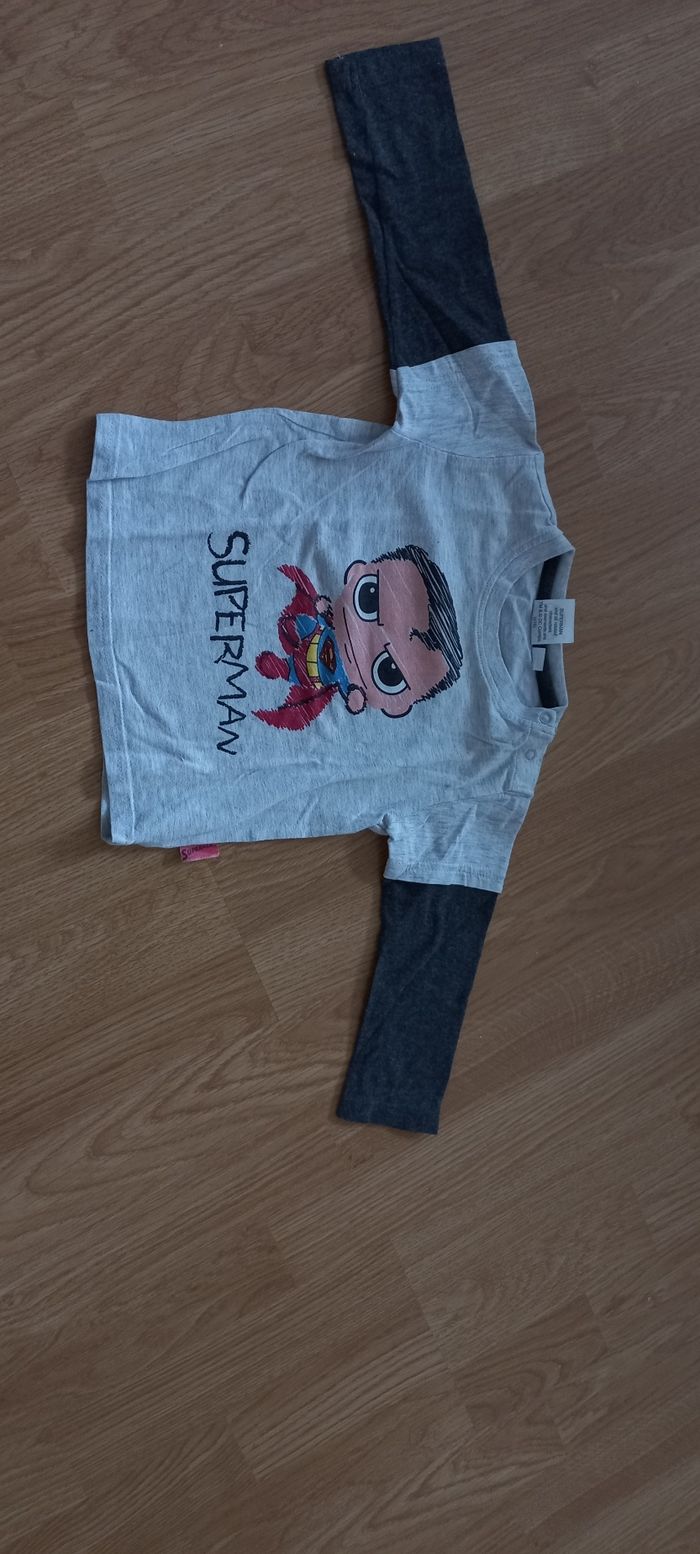 Lot de 7 Tee-shirts manches longues Taille 12 mois - bleu ciel Marque Alphabet - rayé rouge, orange, gris Marque orchestra - rouge avec inscription Marque Grain de blé - gris avec inscription BB Cool Marque Tape à l'œil - jaune avec capuche Marque orchestra - gris clair et gris foncé avec superman Marque DC Comics