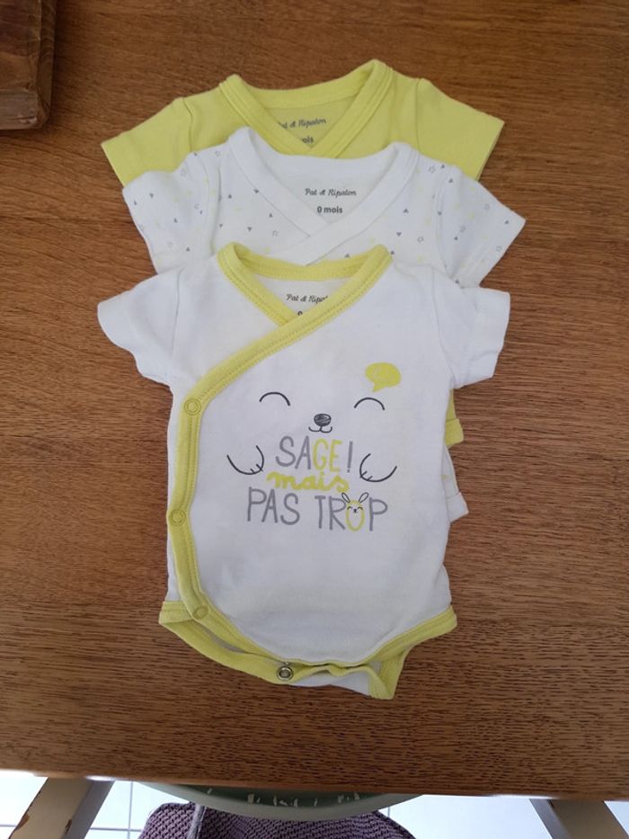 Lot de 2 bodies manches courtes. 1 jaune uni et 1 blanc motifs jaune et gris et 1 sage mais pas trop. Taille 0 mois. Marque pat et ripaton. Très bon état.