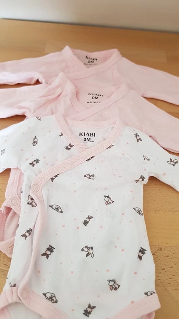 Lot 3 bodies fille 1 rose uni, 1 rose à point blanc, 1 blanc et rose motifs lapin. Marque kiabi. Ouverture par devant très pratique.