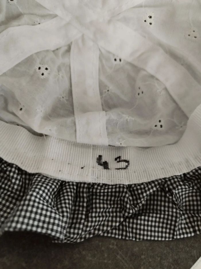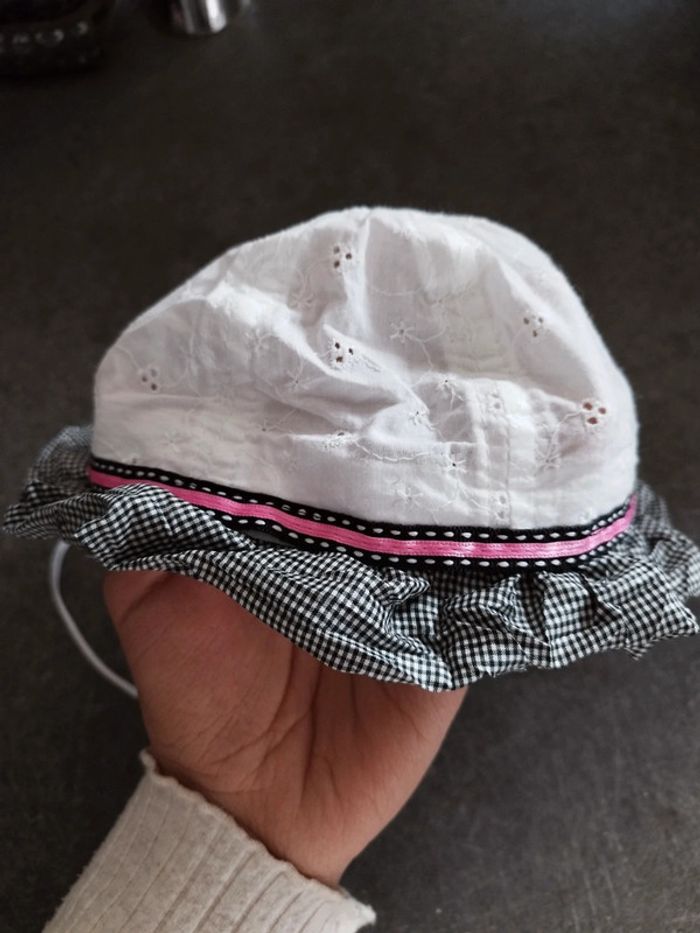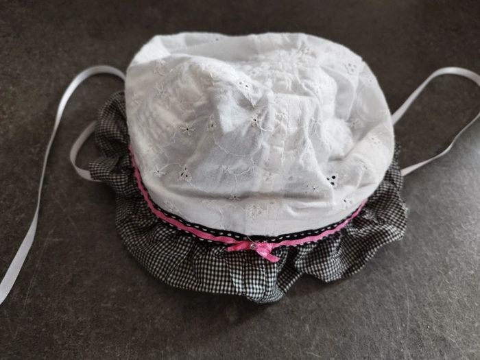 Chapeau en dentelle blanc et bord à carreaux blancs et noirs avec liseré rose,