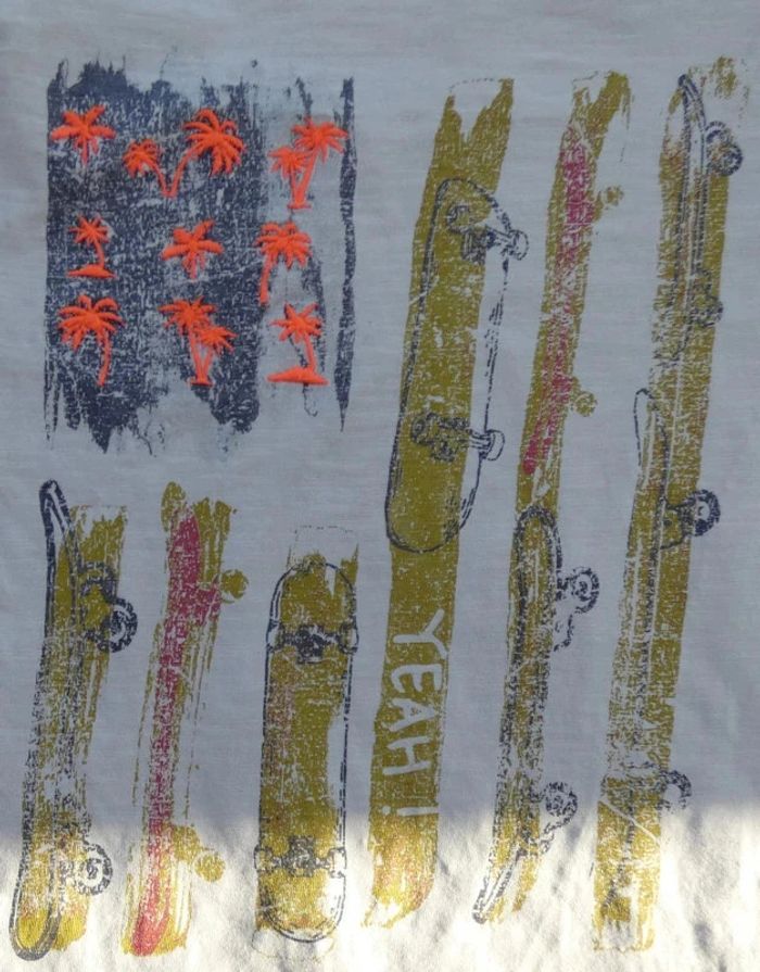 Vends ce joli tee-shirt manches longues pour garçon de 10 ans (140 cm). Marque : Tape à l'oeil. Motif : skateboard / palmiers. Les palmiers fluos sont brodés. Très original. Très bon état : aucun trou, deux petites taches récalcitrantes dans le dos mais peu visibles (voir photos). #titiya76teeshirtgarçon10ans #titiya76garçon10ans #titiya7610ans #titiya76garçon #titiya76tao #titiya76tapealoeil