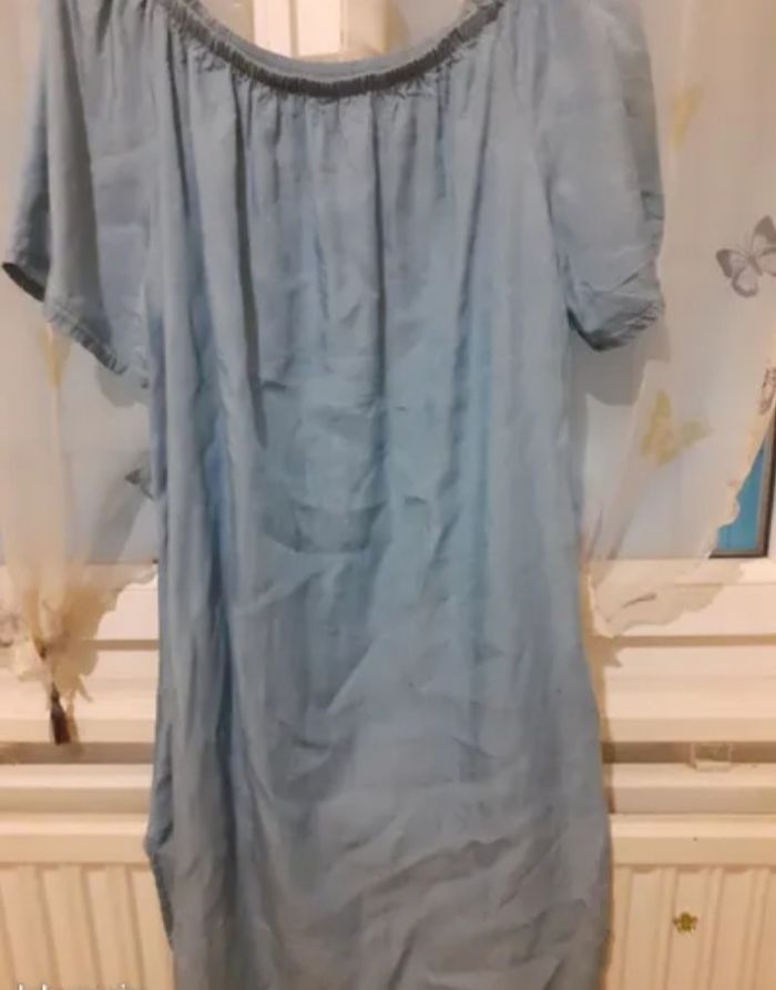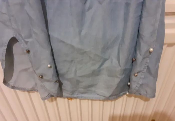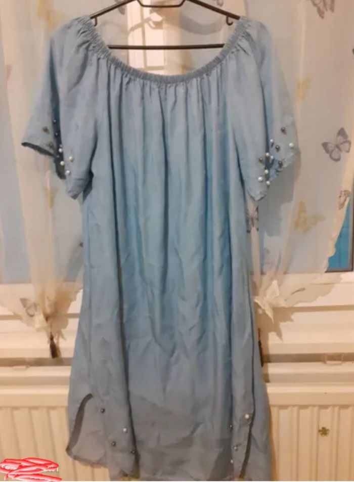 Robe mi longue, bleu jean. Avec perles sur les manches et sur le bas de la robe. Manche courtes. En excellent état Envoi rapide, soigné et sécurisé.