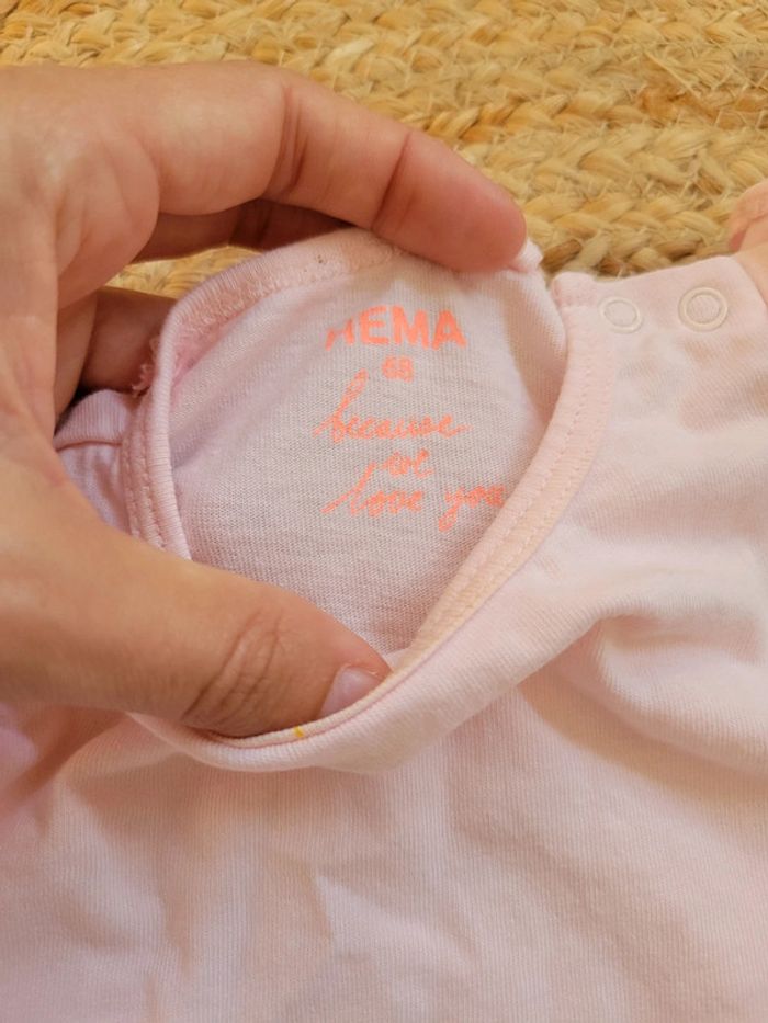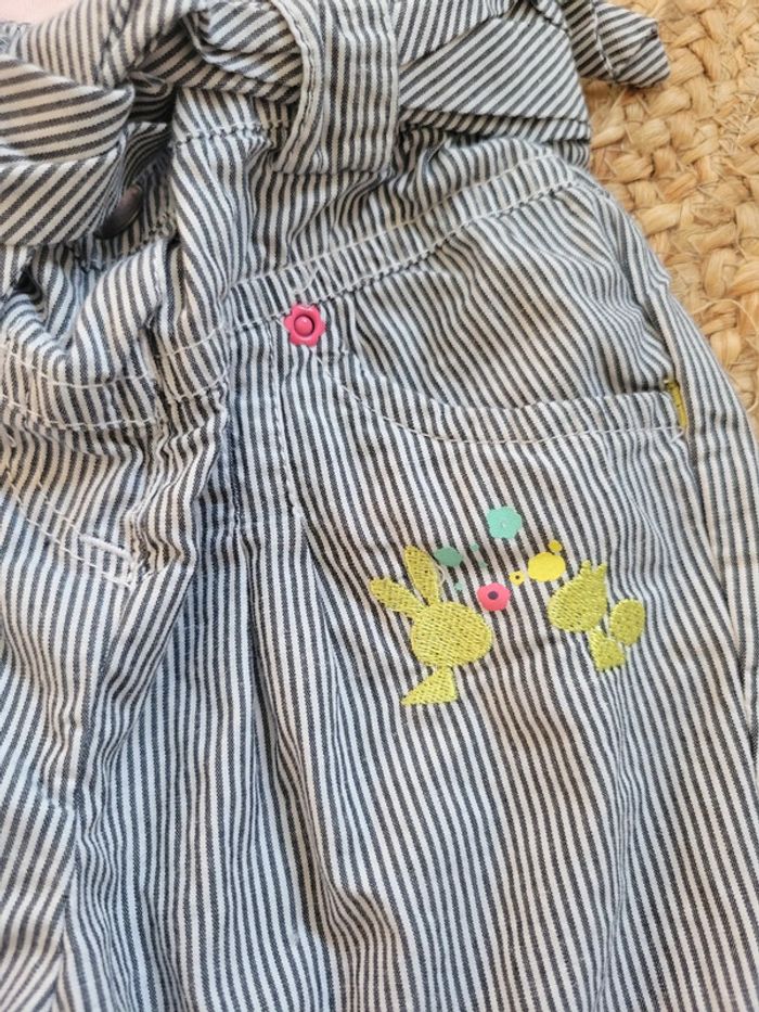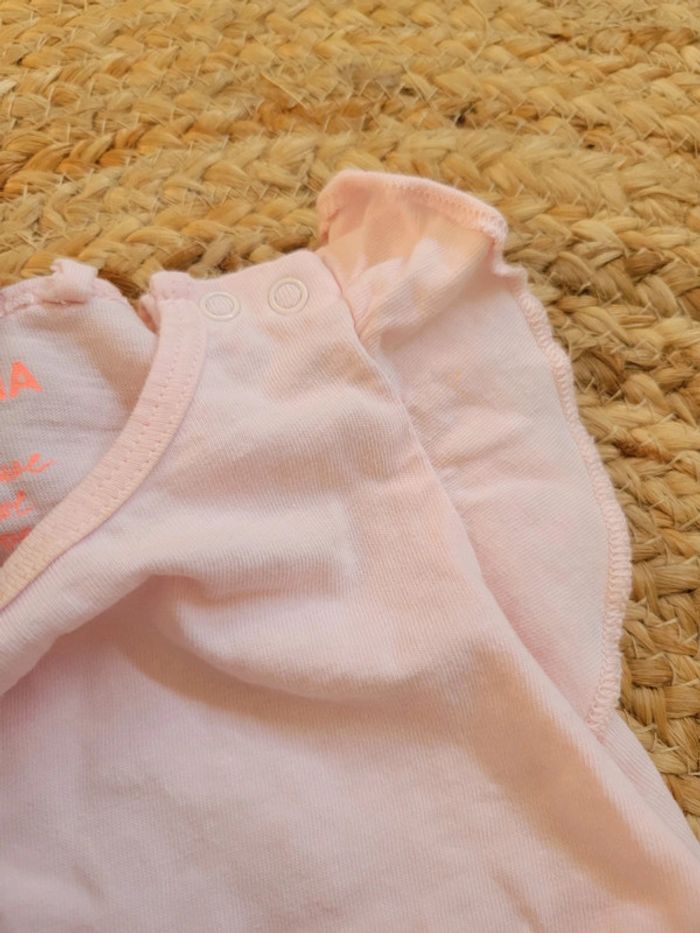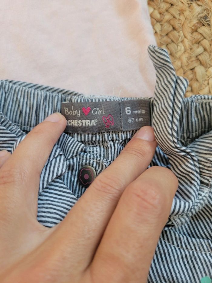 Ensemble en taille 6 mois : - débardeur avec volants au niveau des épaules, rose, de la marque Hema - short rayé de la marque Orchestra