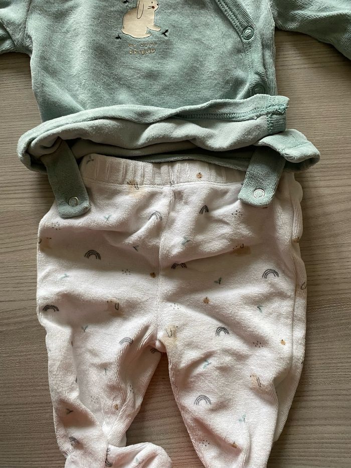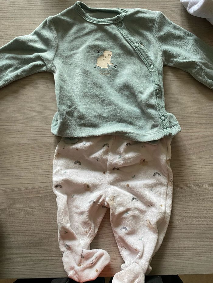 Lot de 4 pyjamas 3 de marque kiabi, en 2 parties, s’attachent devant pour le haut 1 de marque les petits cailloux, en 2 parties, le blanc est légèrement passé