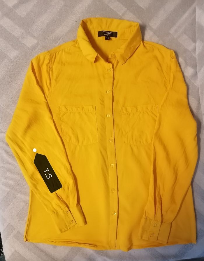 Chemise fluide femme, marque Jennifer. Taille S. Jaune. Manches longues. 2 poches devant. Fermeture bouton. Porté. 3.50€