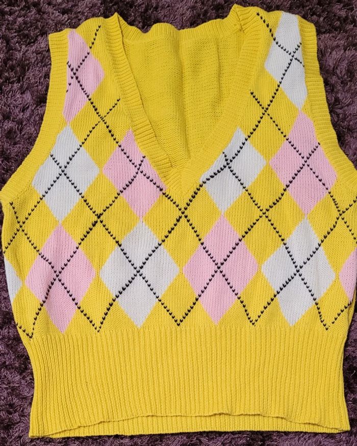 Pull sans manches, col V, court avec joli quadrillage de couleur sur le devant et couleur unie à l'arrière #Lili0405pulls