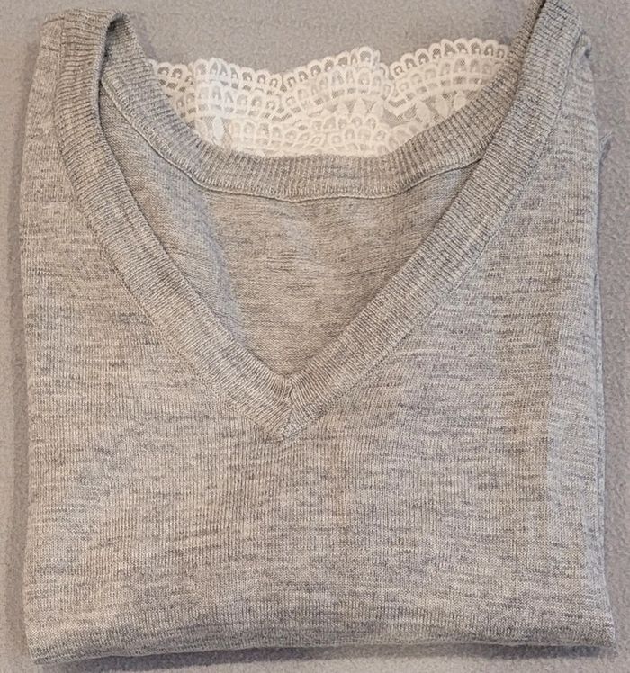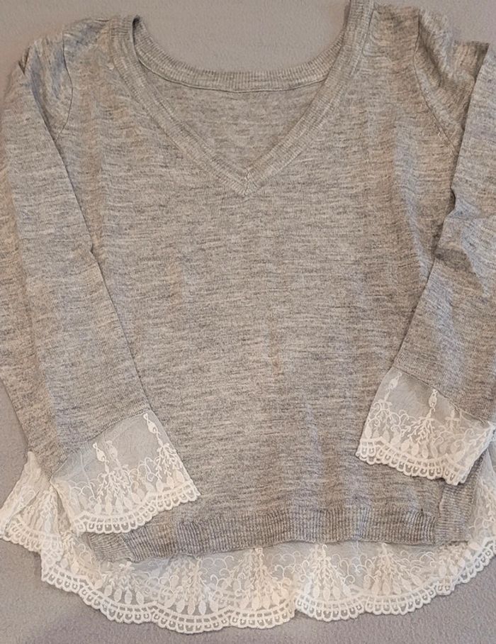 Très joli pull avec dentelle sur le bas des manches et en bas du pull, col en V, en très bon état #Lili0405pulls