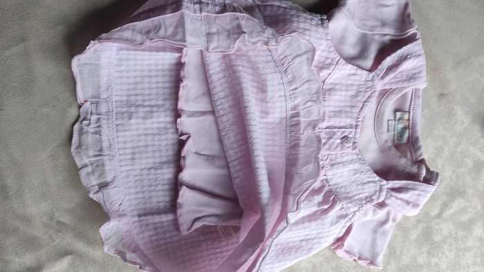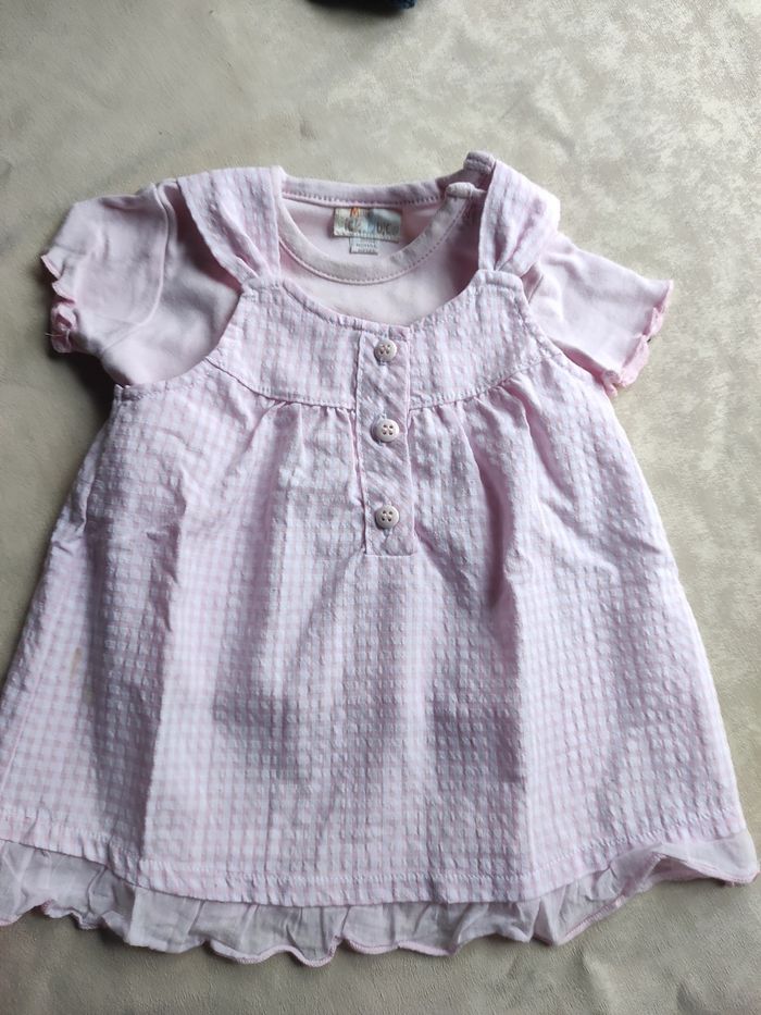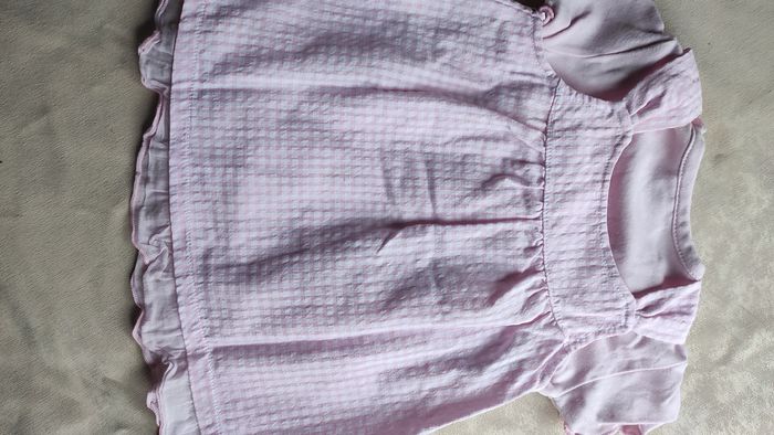 Joli petit ensemble robe style vichy carreaux blanc et rose avec tee shirt amovible rose. Très bon état