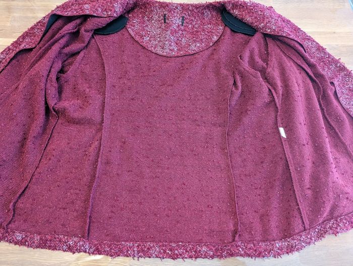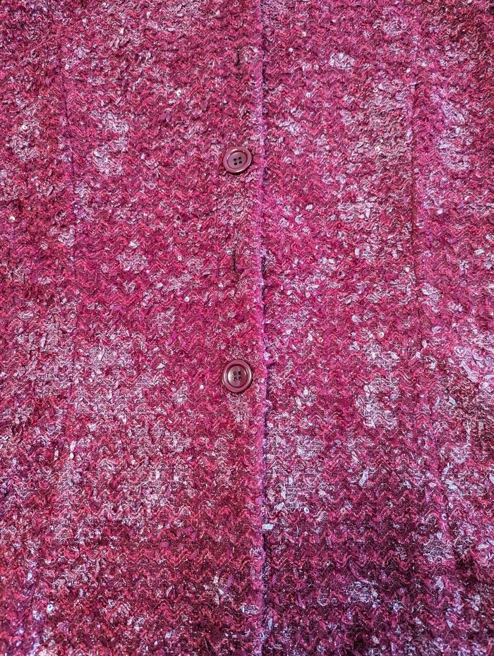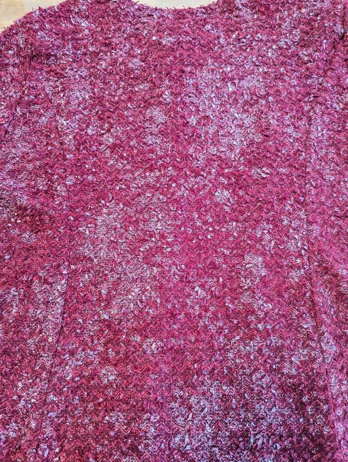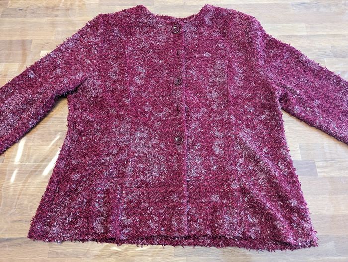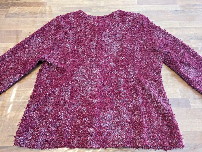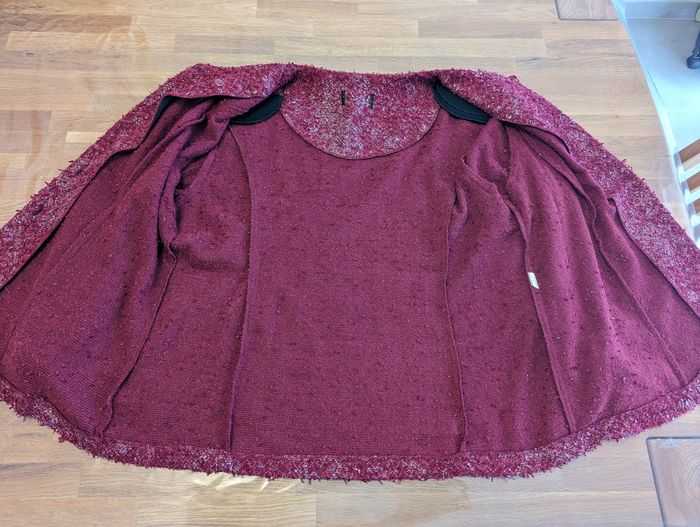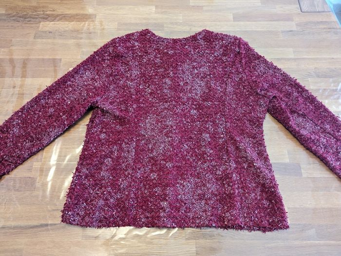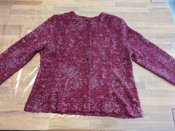 Gilet femme environ taille 50 Très bon état, couleur rouge/ Bordeaux, effet brillant, quelques sequins, joli effet. Épaulettes. La taille est une estimation par rapport à la personne qui portait ce gilet, les étiquettes intérieures sont coupées. Longueur épaules 46 cm Longueur aisselles 60 cm Longueur taille 64 cm Longueur col/taille 65 cm Longueur manches (aisselles/poignets) 39 cm Longueur manches (épaules/poignets) 61 cm