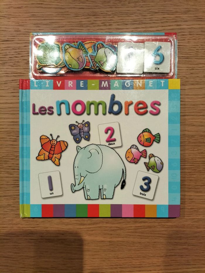 Livre magnétique pour apprendre en s'amusant. Les nombres de 1 à 10 sont représentés par de petits sujets aimantées qui complètent une image différente sur chaque page. Des phrases simples qui guident les tout-petits dans l'apprentissage des nombres. 12 pages. 23 pièces magnétiques. Très utile pour aider les enfants à dénombrer. Complet, en très bon état. À noter une légère usure du coin inférieur gauche devant.