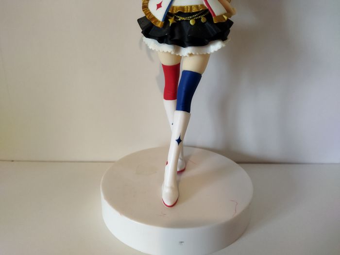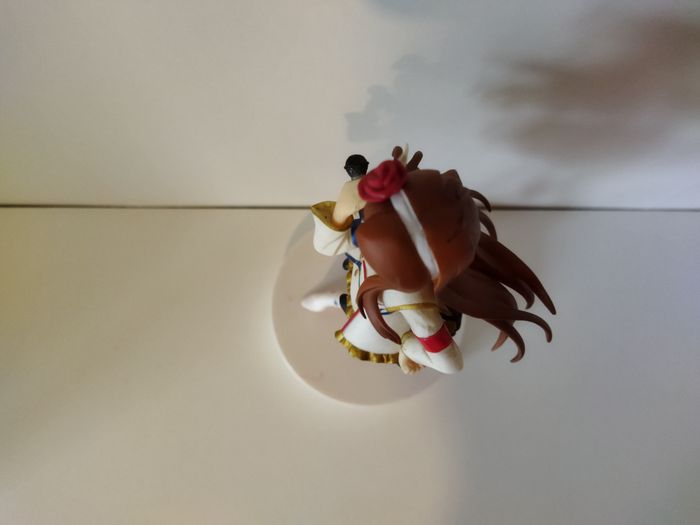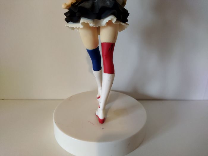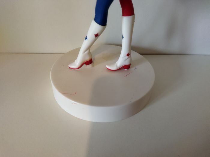 la figurine est d'occasion, sans boite et poussiéreuse. la figurine a de nombreuses marques dans les cheveux, les jambes, le corp, le visage et sur le socle. Une des tiges du socle est cassé.
