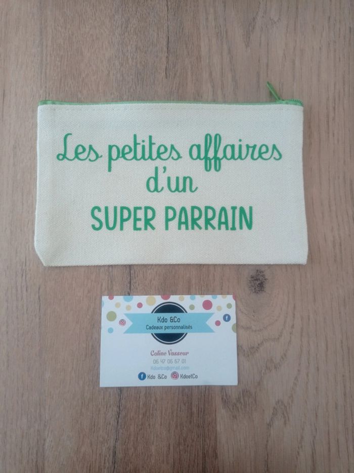 Trousse plate en toile 11x18cm Les petites affaires d'un super parrain #Parrain_KdoetCo #Trousse_KdoetCo Si vous désirez plusieurs articles de mon dressings, envoyez moi un message pour que je regroupe tout dans une annonce. Vinted ne permet pas de faire des lots dans les dressings pros et ça vous permettra de ne pas avoir à payer plusieurs fois les frais de ports.