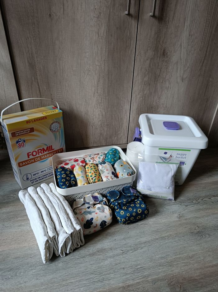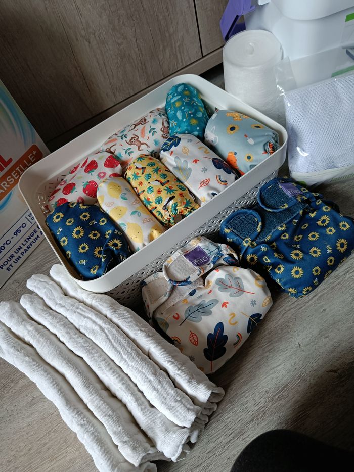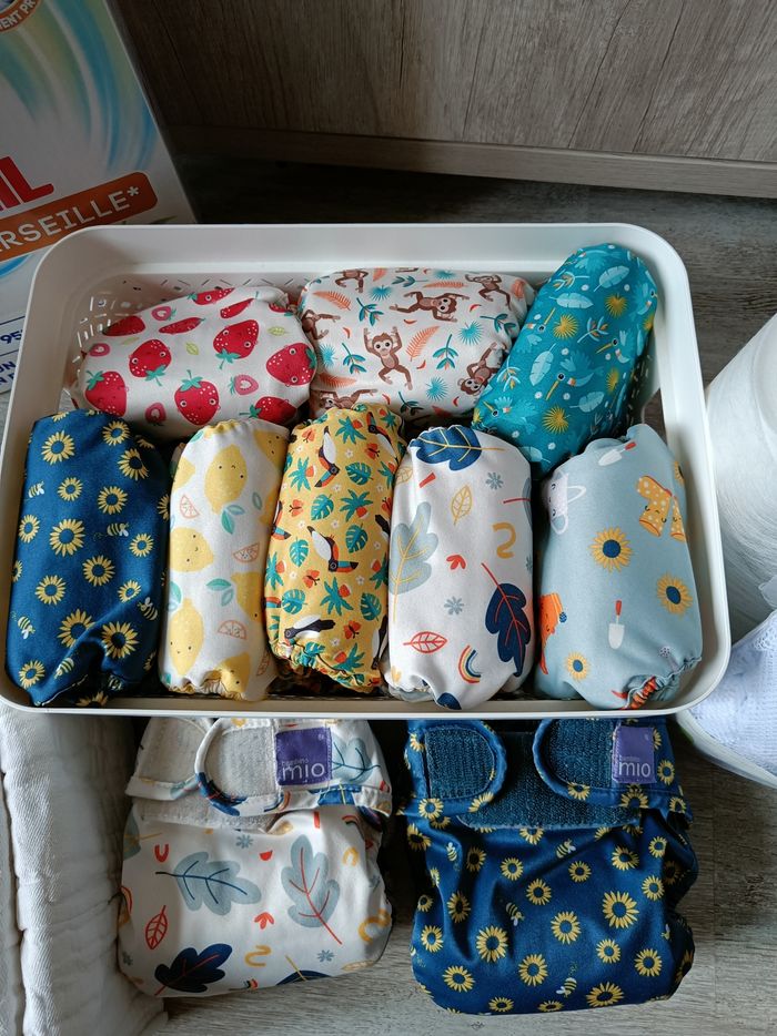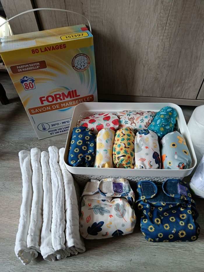 Parfait pour débuter avec les couches lavables. Ce lot contient : 10 couches lavables bambino Mio TE2 mioduo en taille 1 ( -9kg) 15 inserts ( 10 qui sont déjà dans les couches + 5 supplémentaires pour faire le roulement) 1 rouleau de voile de protection 1 poubelle bambino Mio neuve 2 filets pour de lavage neuf dans l'emballage d'origine 1 carton de lessive Formil neuf, 60 lavages, jamais ouvert, adapté pour laver les couches lavables Les inserts ont été decrassés et sentent bon la lessive. N'hésitez pas si vous avez des questions ☺️