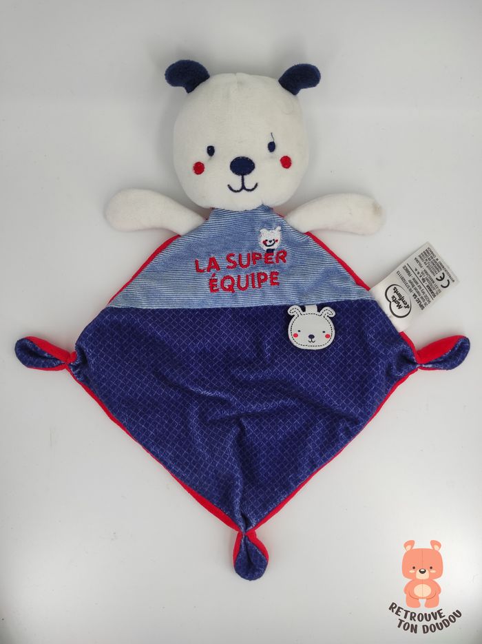🐶 Doudou Plat Chien Blanc, bleu et rouge avec inscription "la super équipe", marque Mots d'Enfants, Leclerc. 📏 Dimension : 20 x 30 cm environ ✨ Occasion, Excellent état, comme neuf 🧼 Lavé avec lessive hypoallergénique 👀 Vous achetez le doudou que vous voyez sur les photos.