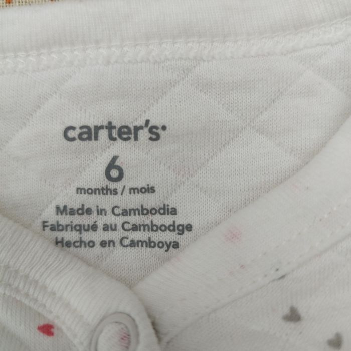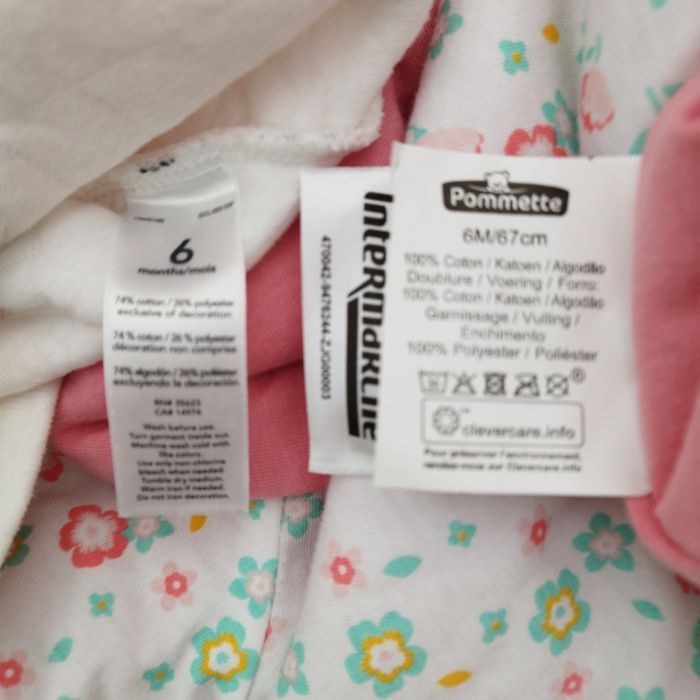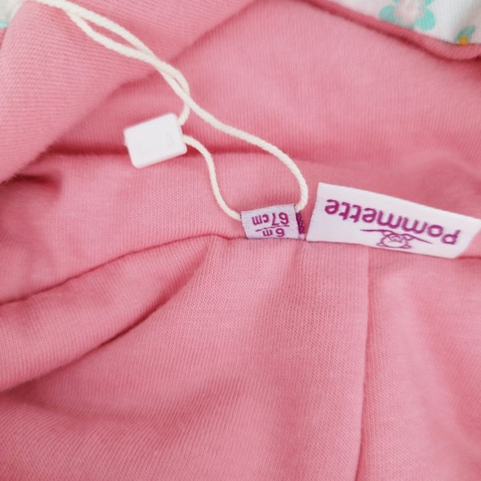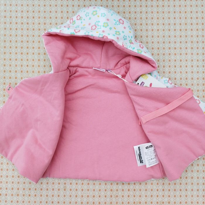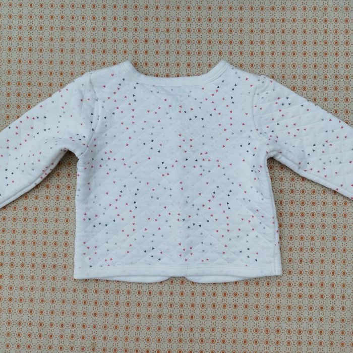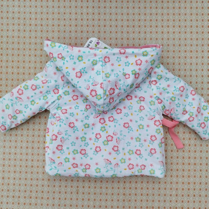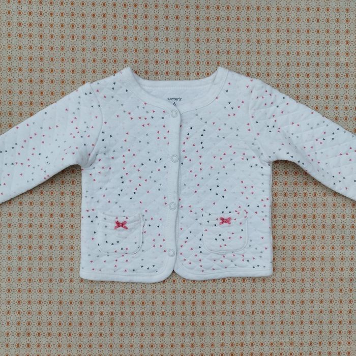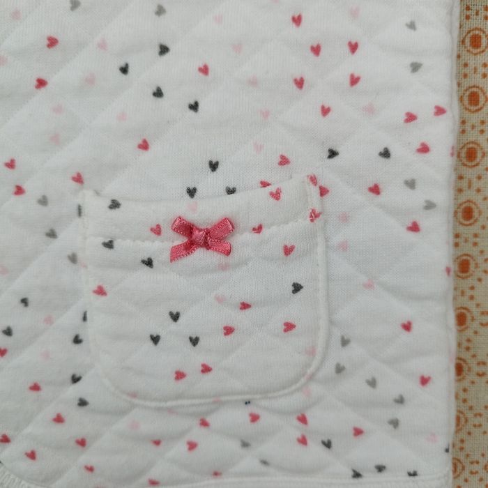 Indispensable dans le garde-robe de bébé. Veste à capuche tout doux, avec un motif floral. Elle se ferme avec un nœud et un rivet à l'intérieur. Marque Pommette avec étiquette. Le gilet Carters avec un motif coeur est en très bon état.