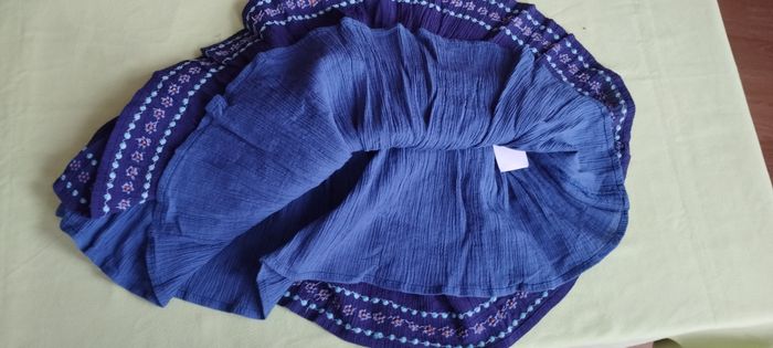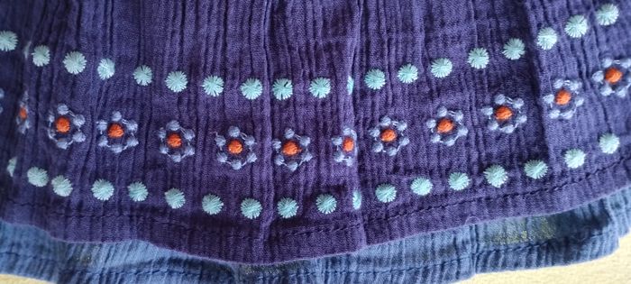 Jolie jupe pour fille de 3ans, taille élastiquée, bleu marine et bleu pétrole, ornée de broderie fleurs bleu et turquoise. Comme neuf !