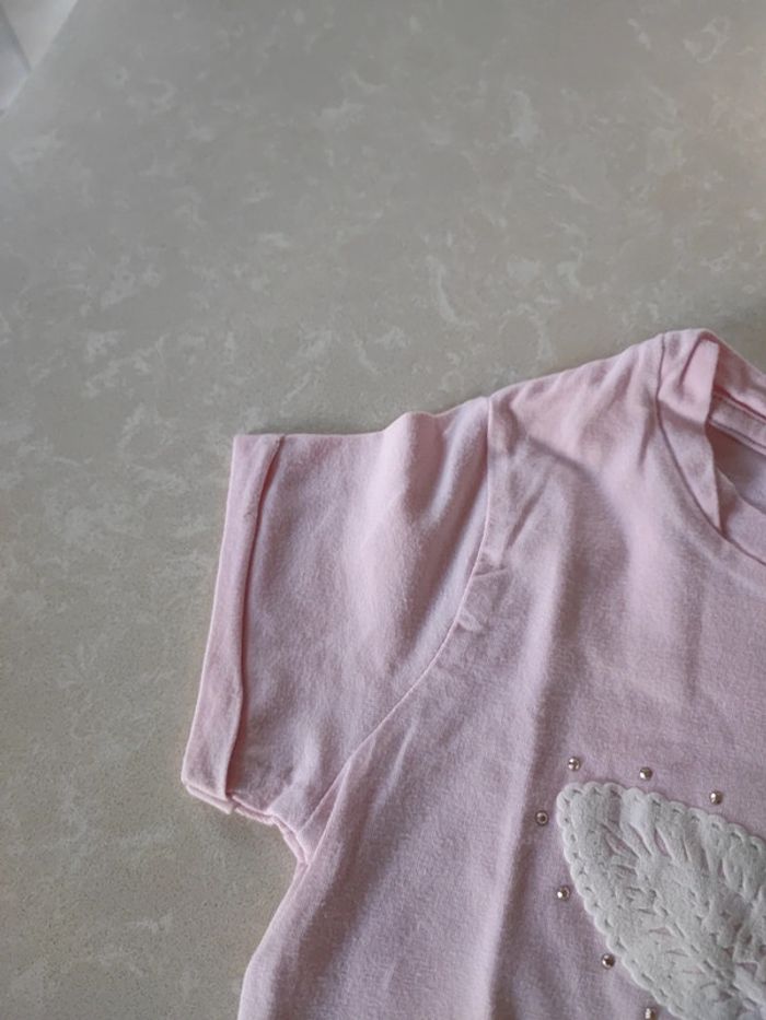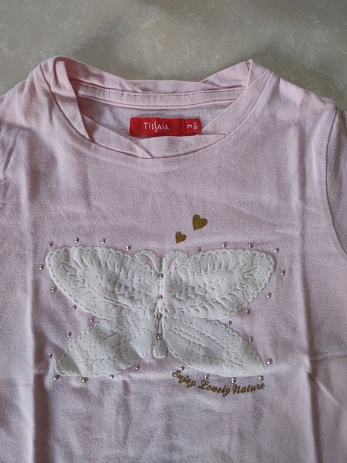 Joli tee short rose tendre avec papillon blanc . Neuf jamais porté. Marque : tissaia. #pepettechoupette_3ans #teeshirtneuf3ans