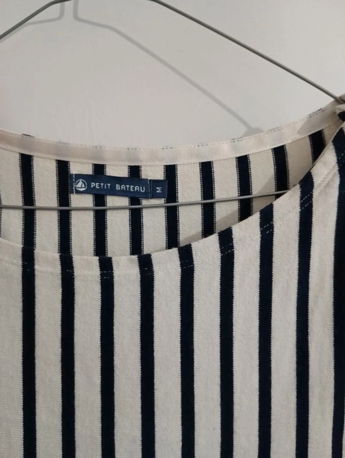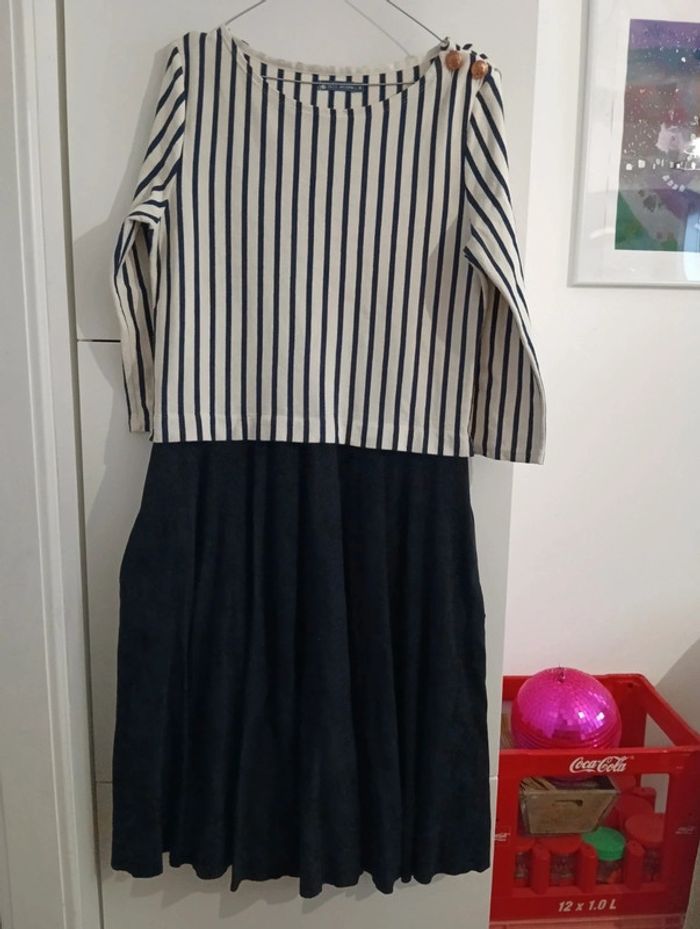 Robe petit bateau taille M Boutonnée à l'épaule Haut rayures verticales Bas jupe noir Encore référencée sur le site de la marque voici sa description : la partie haute de la robe est en jersey lourd, avec une rayure renversée par rapport au vêtement de la saison précédente, qui devient verticale, plus courte et plus près du corps. L'épaule est fermée par boutons cloches en métal cuivré. Le bas est une jupe fluide en côte 1x1, longueur midi, qui tourne à chaque mouvement. La jupe est coupée bord franc pour avoir un fini pur et léger. Une robe femme en trompe l'œil, façon Audrey Hepburn. Vêtement disponible en tailles XXS-XS-S-M-L. Matière : 100% Coton Ref 2464163210
