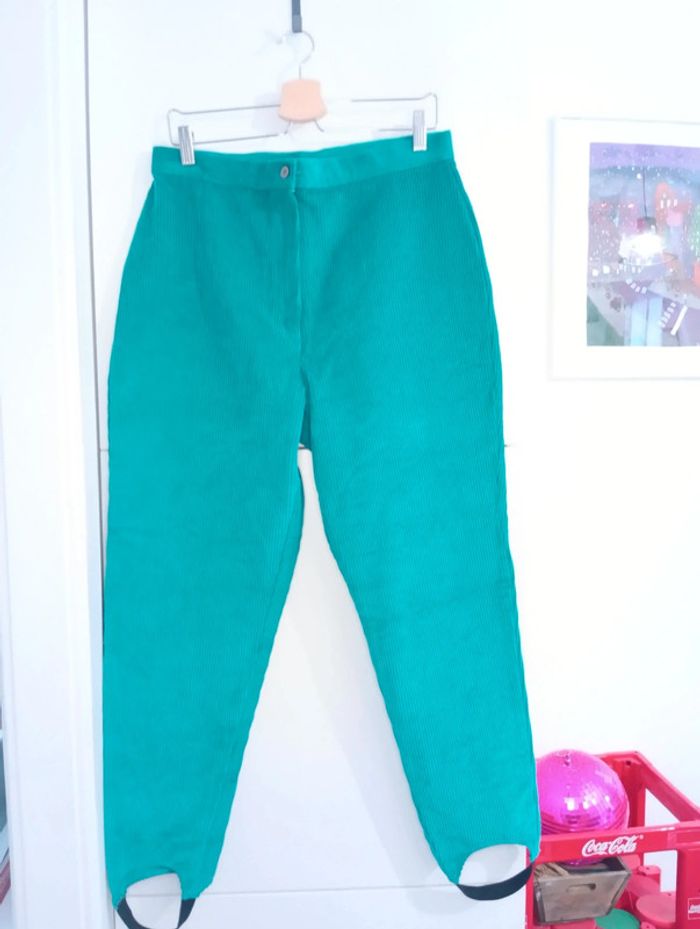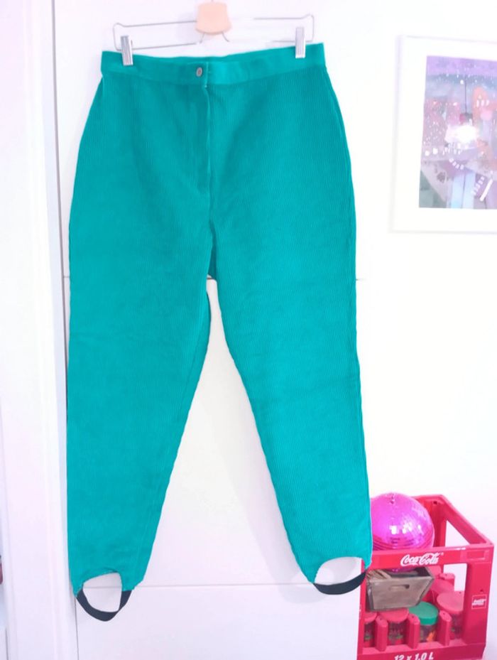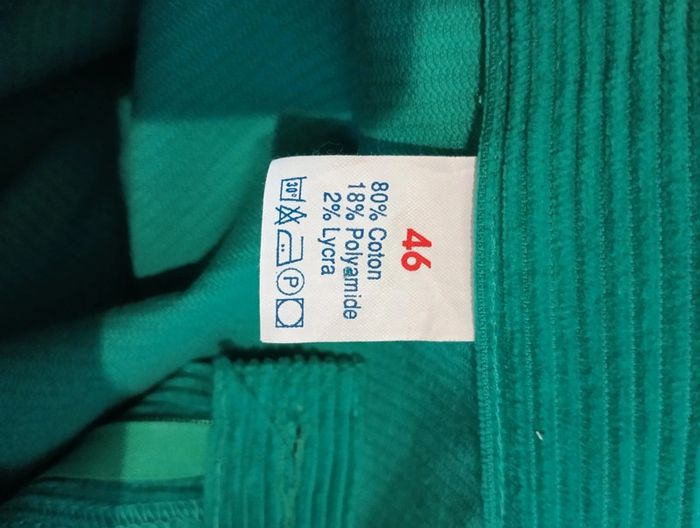 Pantalon velours fuseau vintage vert émeraude taille 42 Très jolie couleur, difficile à restituer en photo Taille haute indiquée 46 mais convient à 42. Mesures Taille 40cm De la taille à l'entrejambe 36cm Longueur (sans les élastiques)102cm