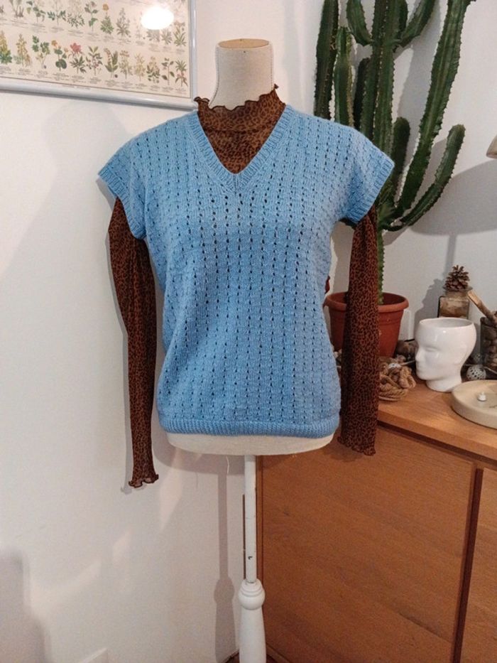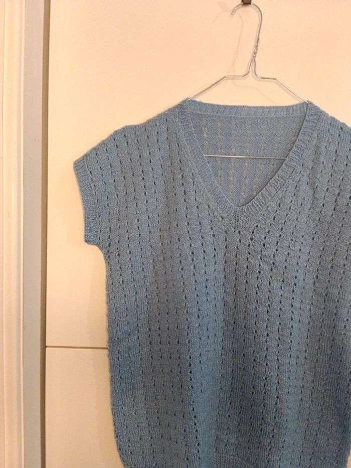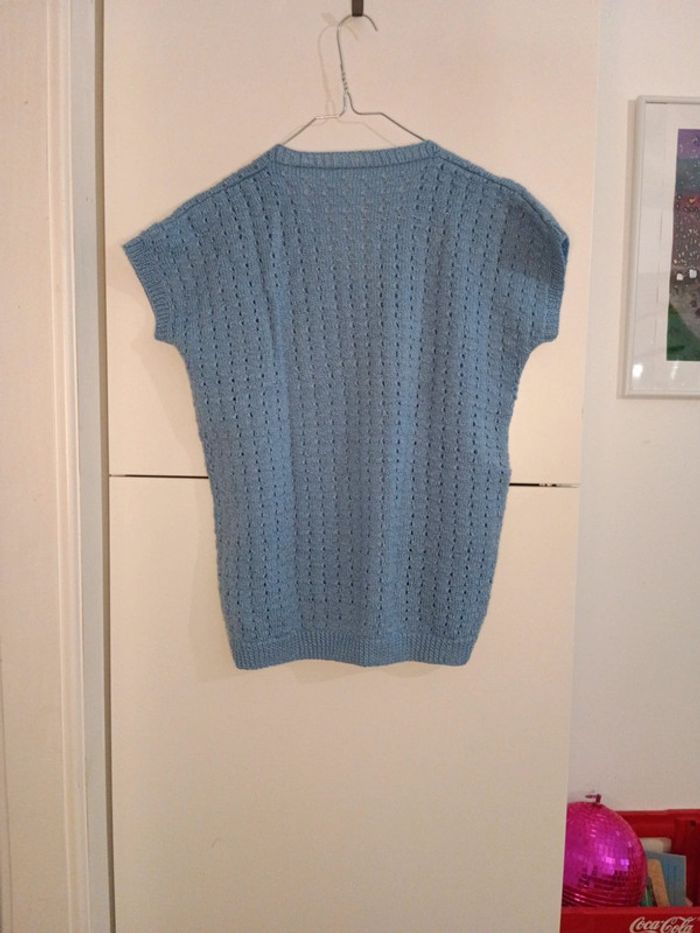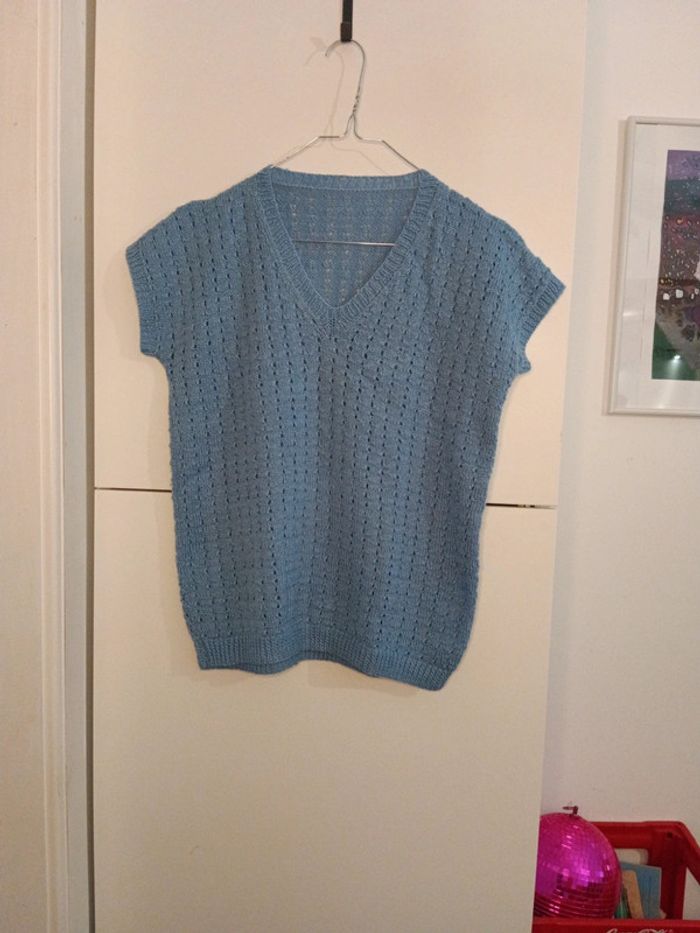 Pull handmade manches courtes bleu pastel taille 38 estimée . A porter seul ou sur un top Mesures Épaules 58cm d'un bout de la manche à l'autre Aisselles 49cm Longueur 60cm