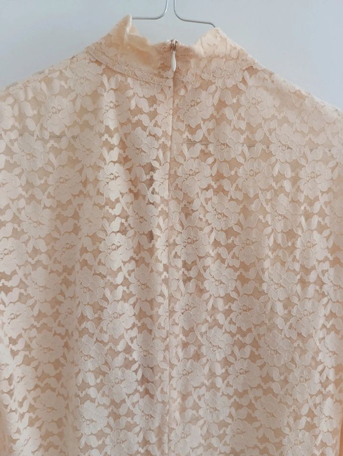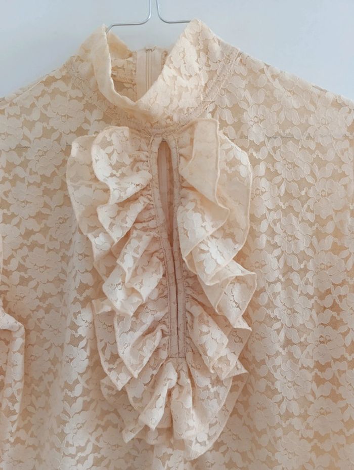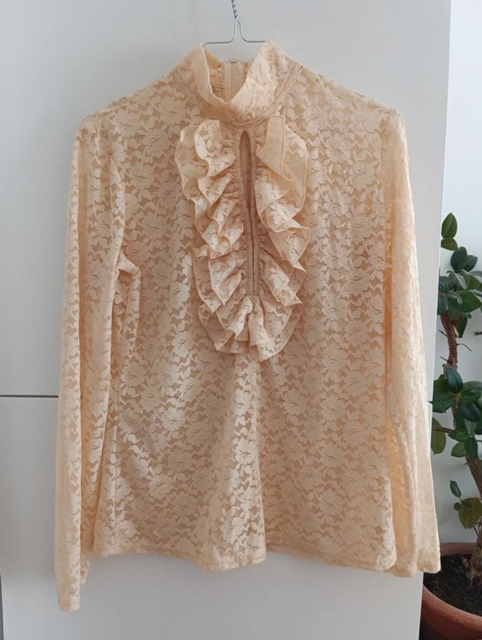 Blouse dentelle vintage écru/beige col jabot Taille 38/40 Col montant,jabot Fermeture au dos Mesures Épaules 39 Longueur Dos 65 Aisselles 50