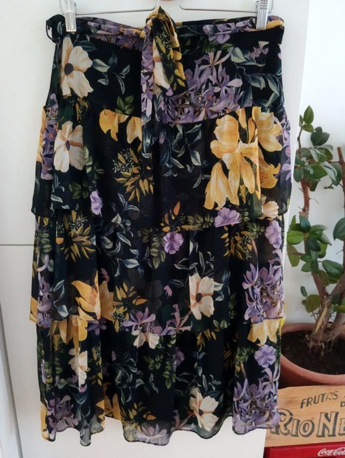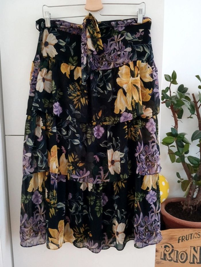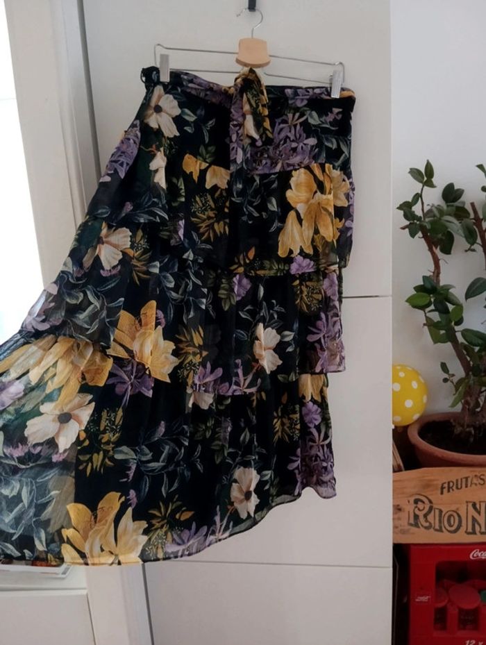 Jupe fleurie voile Mango taille L Ceinture assortie Effet volanté sur plusieurs étages Fermeture sur le côté Taille 43cm Longueur 80cm