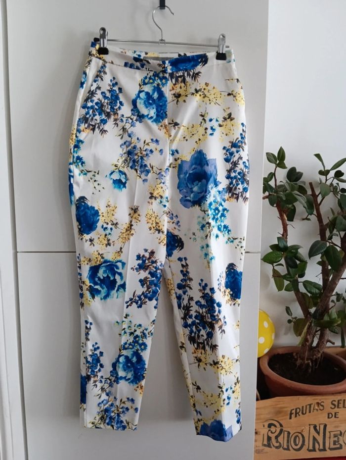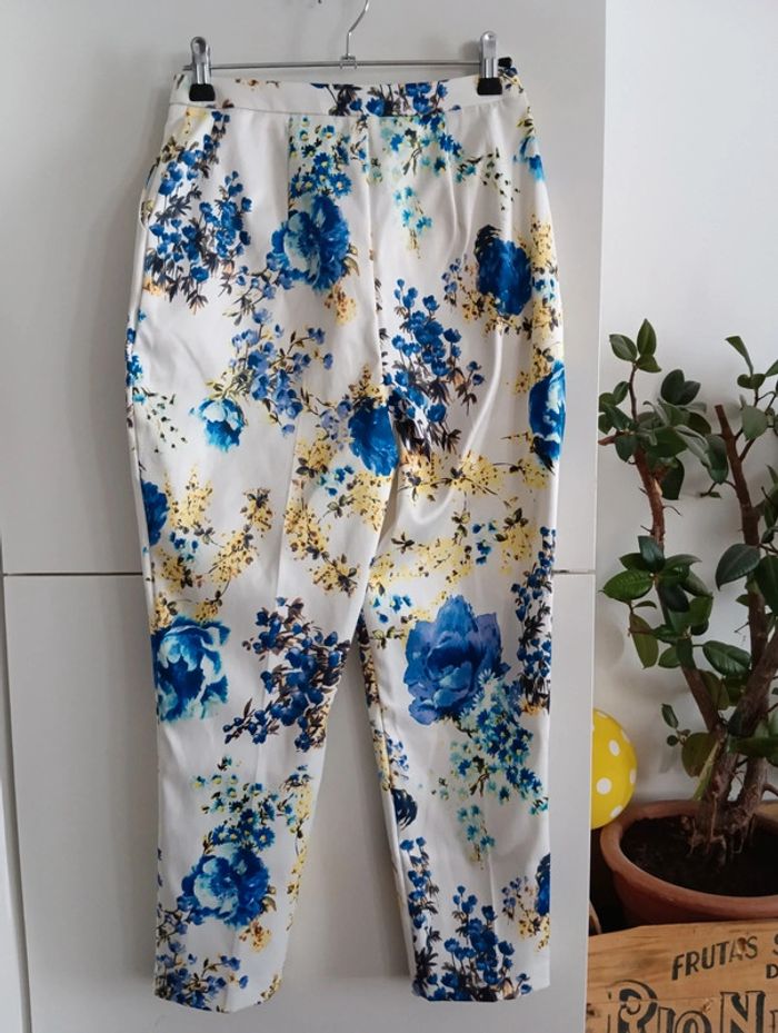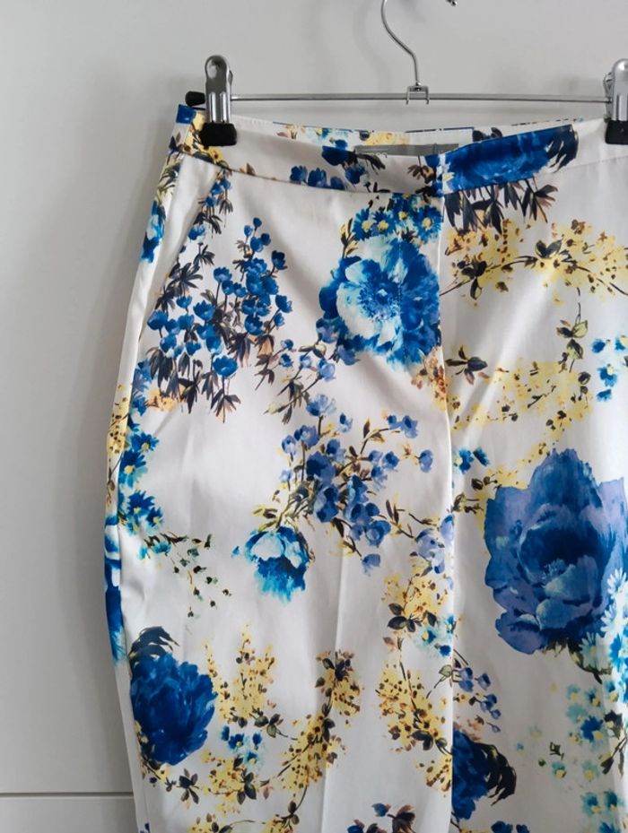 Pantalon 7/8ème fond blanc fleurs  bleu et jaunes taille 32 matière satinée - photo numéro 2