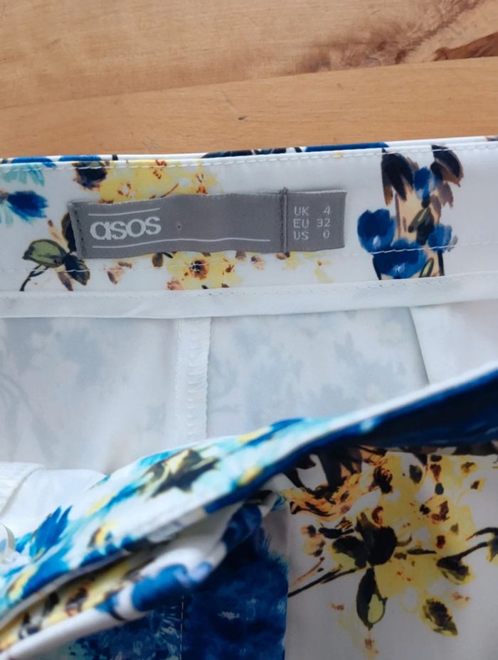 Pantalon 7/8ème fond blanc fleurs  bleu et jaunes taille 32 matière satinée - photo numéro 6