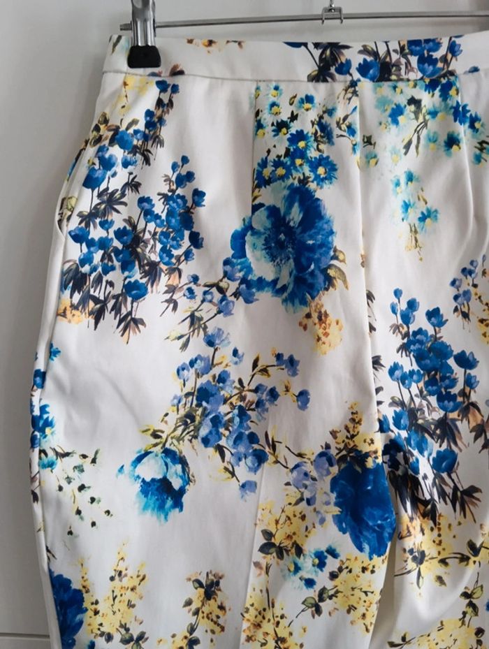 Pantalon 7/8ème fond blanc fleurs  bleu et jaunes taille 32 matière satinée - photo numéro 3