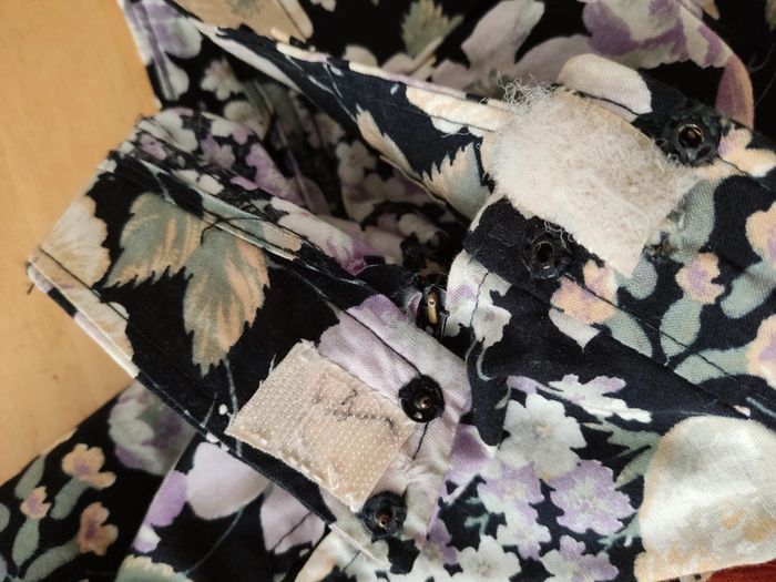 Jupe midi vintage à fleurs,.100% coton taille 34/36 estimée, à confirmer avec les mesures Taille 33 cm Longueur 72cm Fermeture par velcro et pressions. Ne se voit absolument pas quand la jupe est portée.