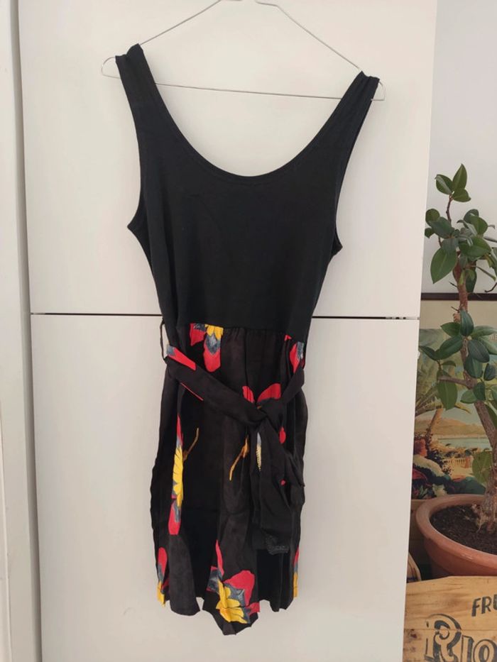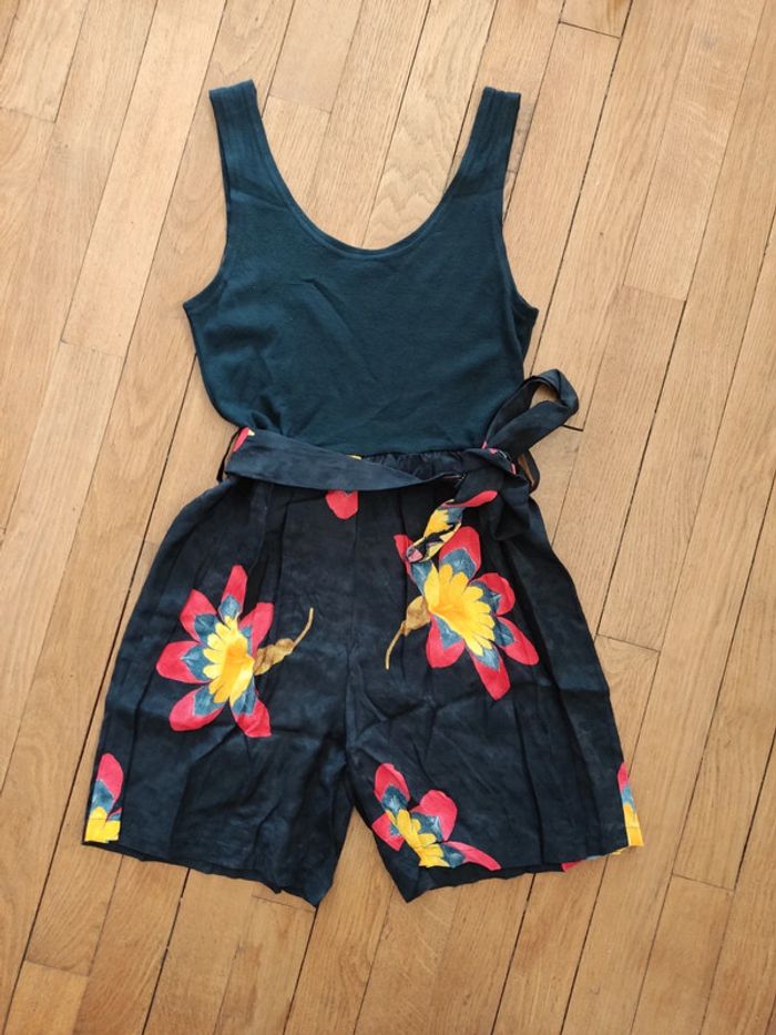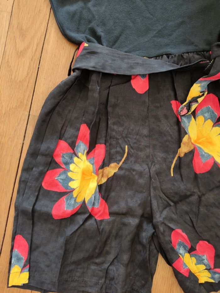 Combinaison combi-short léger taille 34 estimée Ceinture assortie Noire grosses fleurs jaunes et rouges Fabriquée en France Mesures Epaules 31 Aisselles 37 Taille 35 Longueur 78cm
