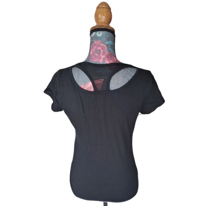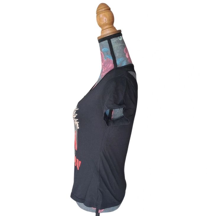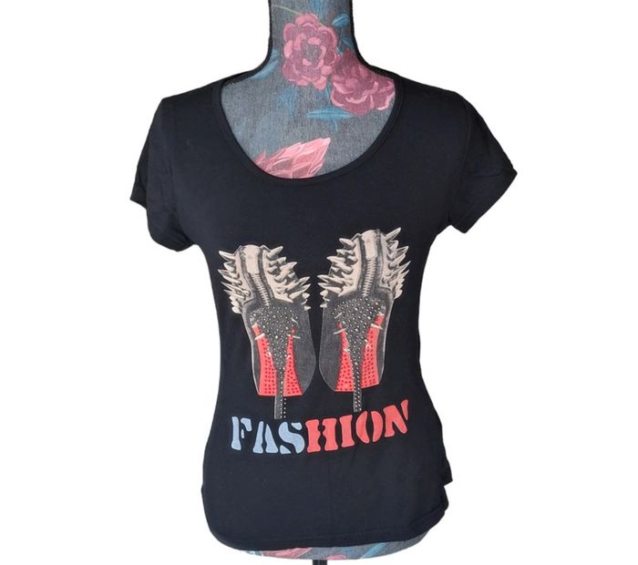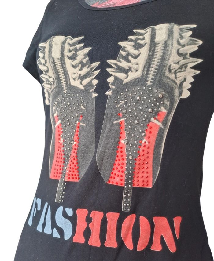 T-shirt femme imprimé et strass Taille S Épaule à Épaule 34 cm Longueur 56 cm En très bon état #lili7606tailleS #lili7606tshirt #tshirtfemme36 #tshirttalon36 #topfemme36 #tshirtnoirimprimé36 #tshirtfemme