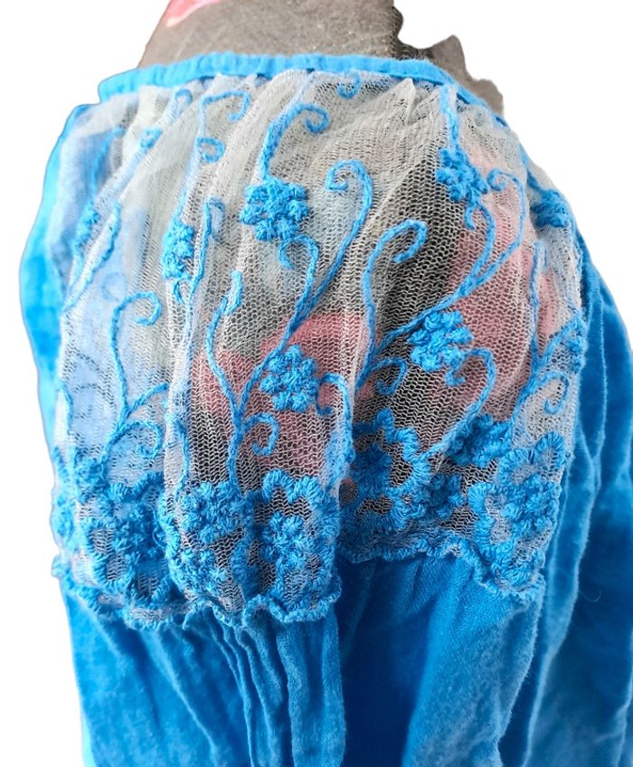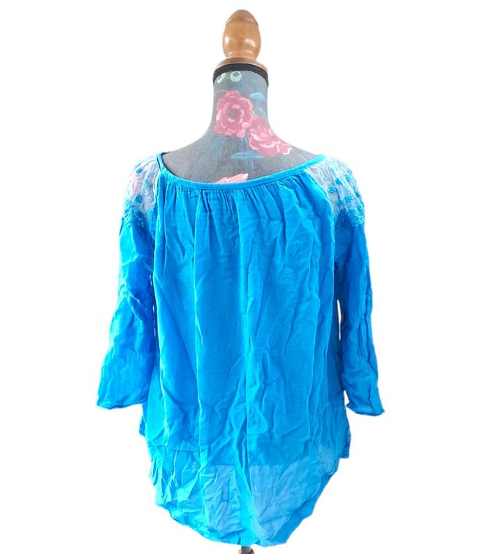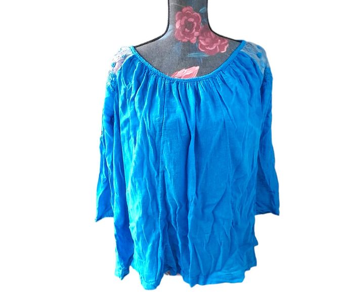Blouse bleu avec épaules transparente Taille L . Epaule à Épaule 56 cm Longueur 60 cm #lili7606tailleL #lili7606tshirt #blousebleufluide40 #blousebleue40 #blousefemme40 #blouselegere40 #blousemanches3quart